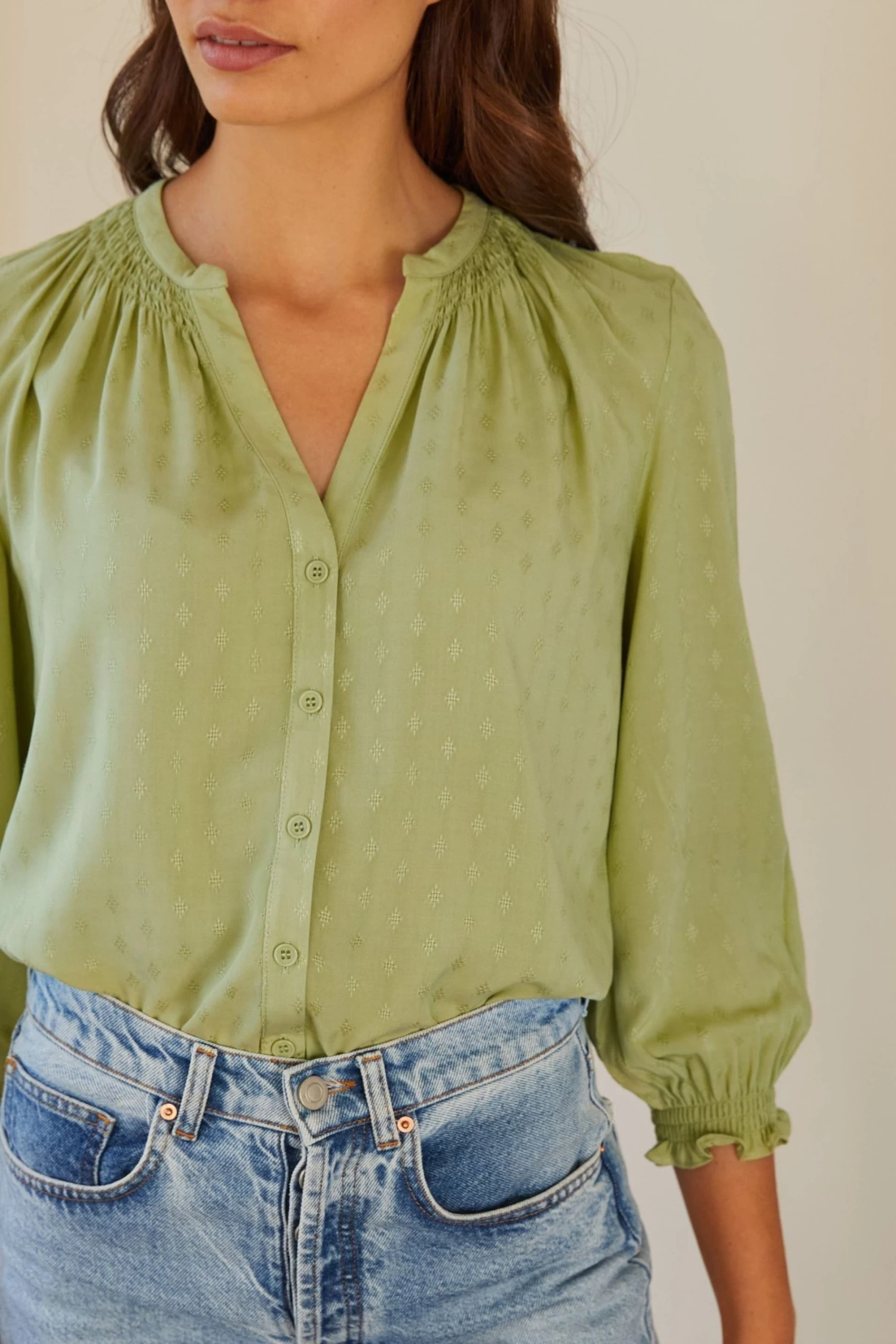 An easy fitting V-neck blouse with a subtle jacquard texture in soft green. Designed with gentle shirring around the neck and cuffs. Made From 100% Ecovero viscose. Model is 5 9 and wearing a size 8.