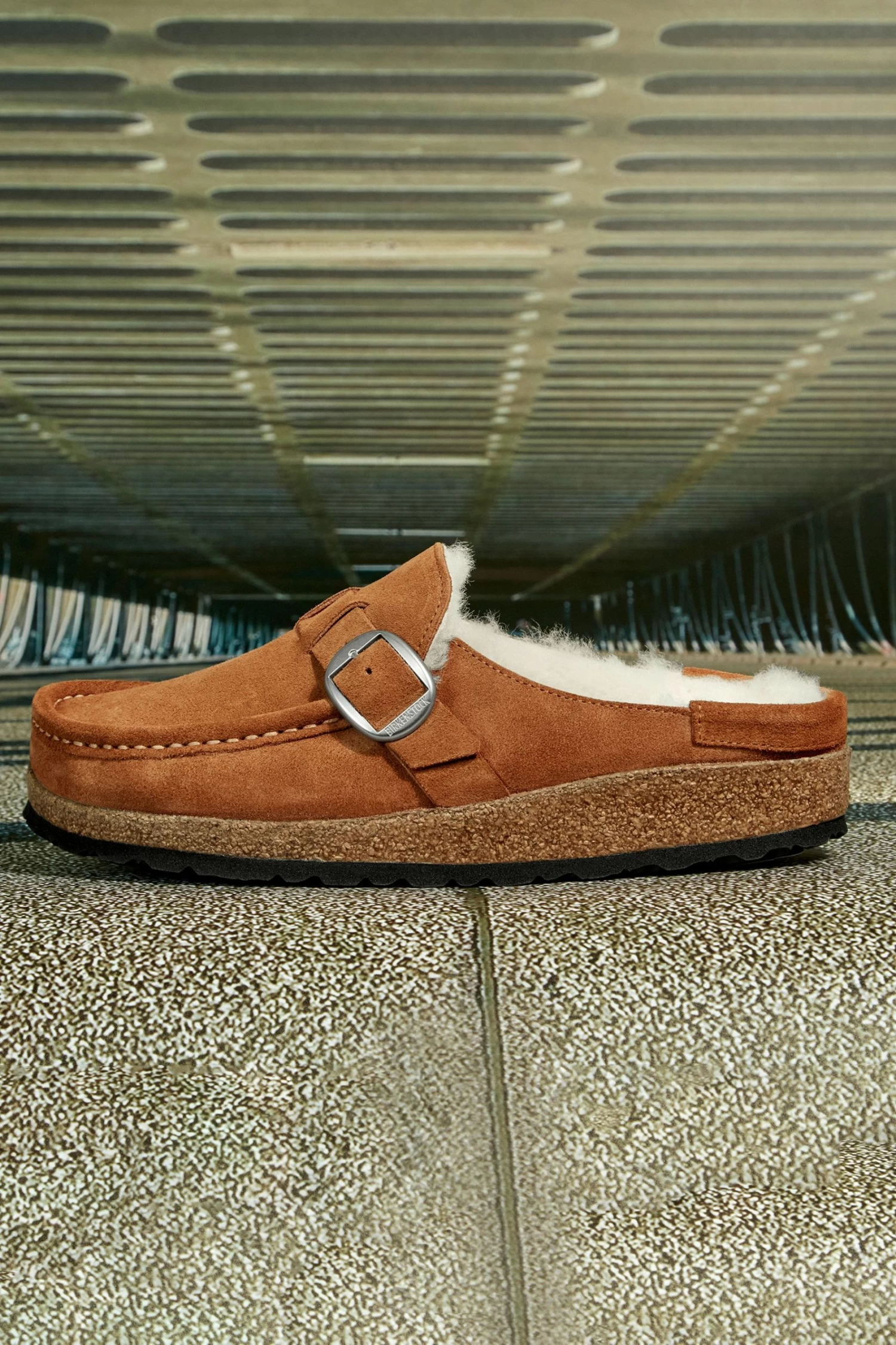 The BIRKENSTOCK Buckley is a semi-open moccasin-style clog that’s instantly recognizable as an authentic BIRKENSTOCK original thanks to its thick cork sole. The striking stitching catches the eye. Here, the classic model comes in a particularly cozy version with shearling and our popular Big Buckle. The perfect shoe for cozy winter evenings by an open fire! Its natural design is down to the upper made from especially soft suede, which hugs the foot like a second skin.