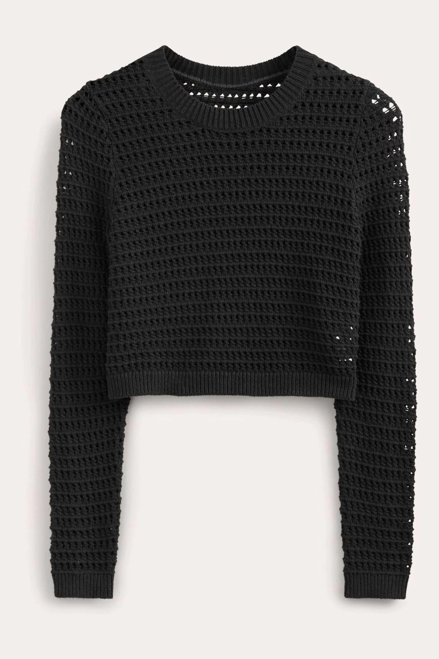 This chunky-knit jumper has been crocheted from cotton for a semi-fitted, cropped silhouette. Style yours with high-rise jeans or skirts.