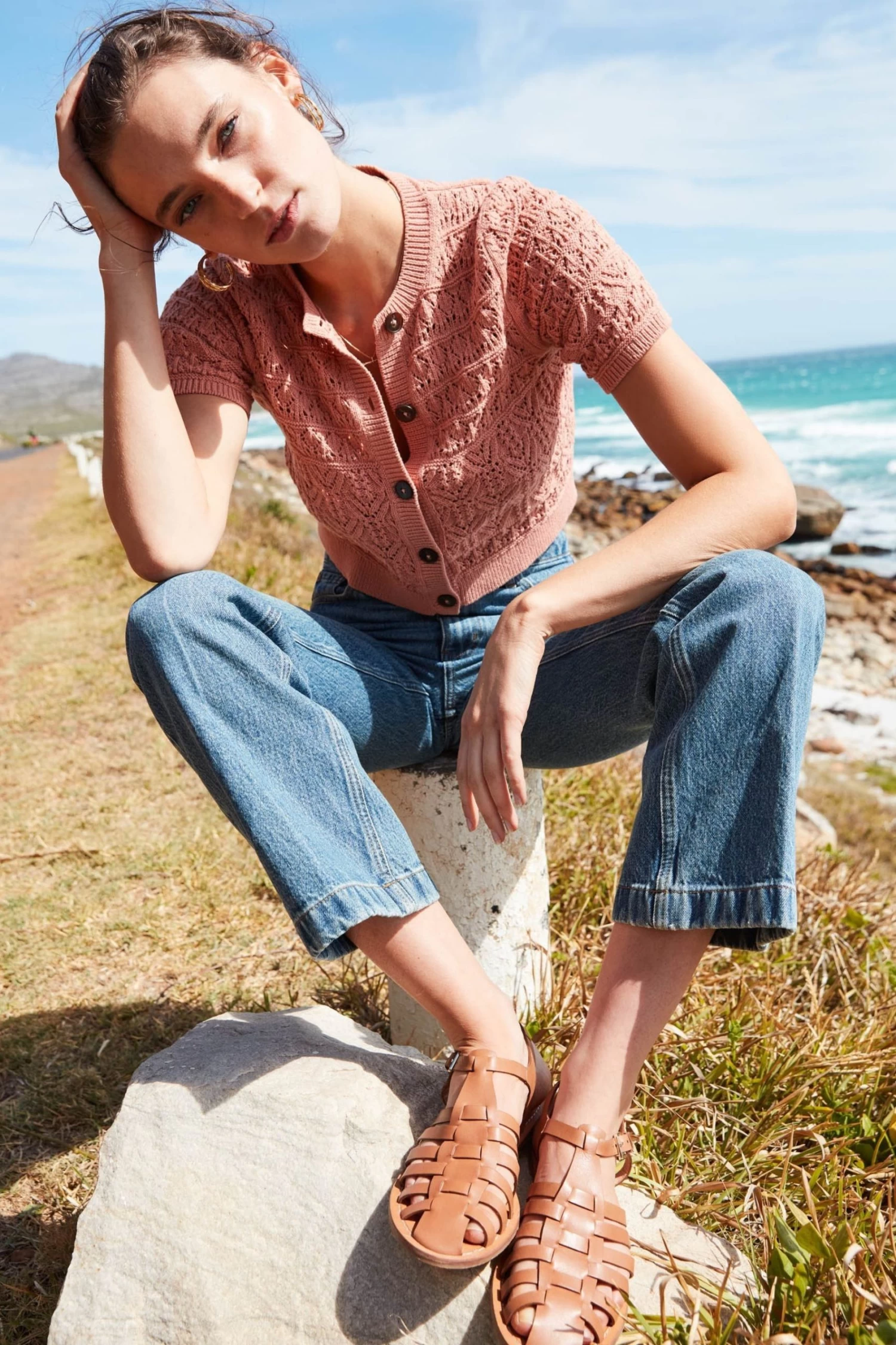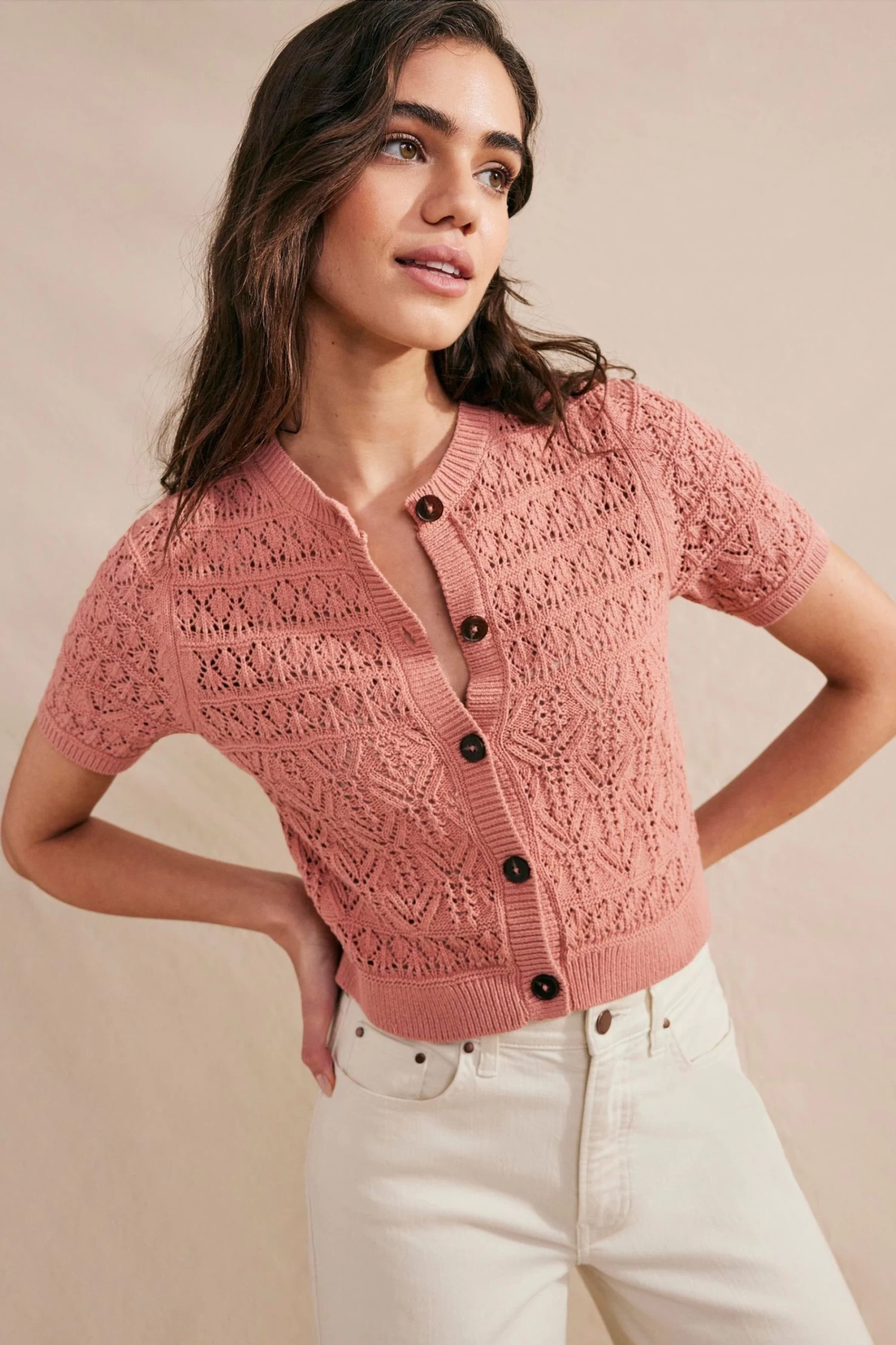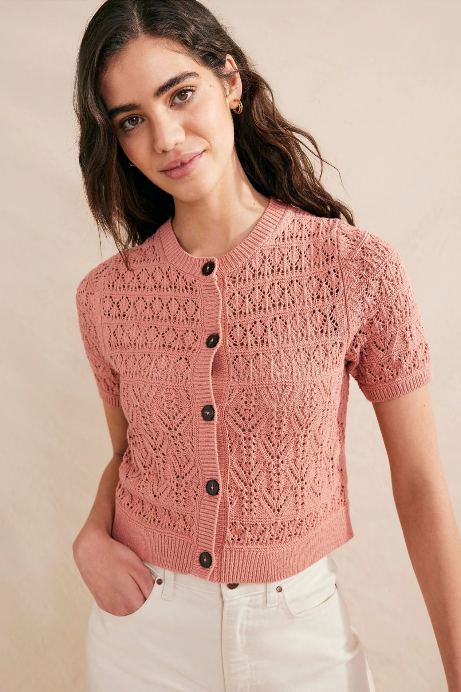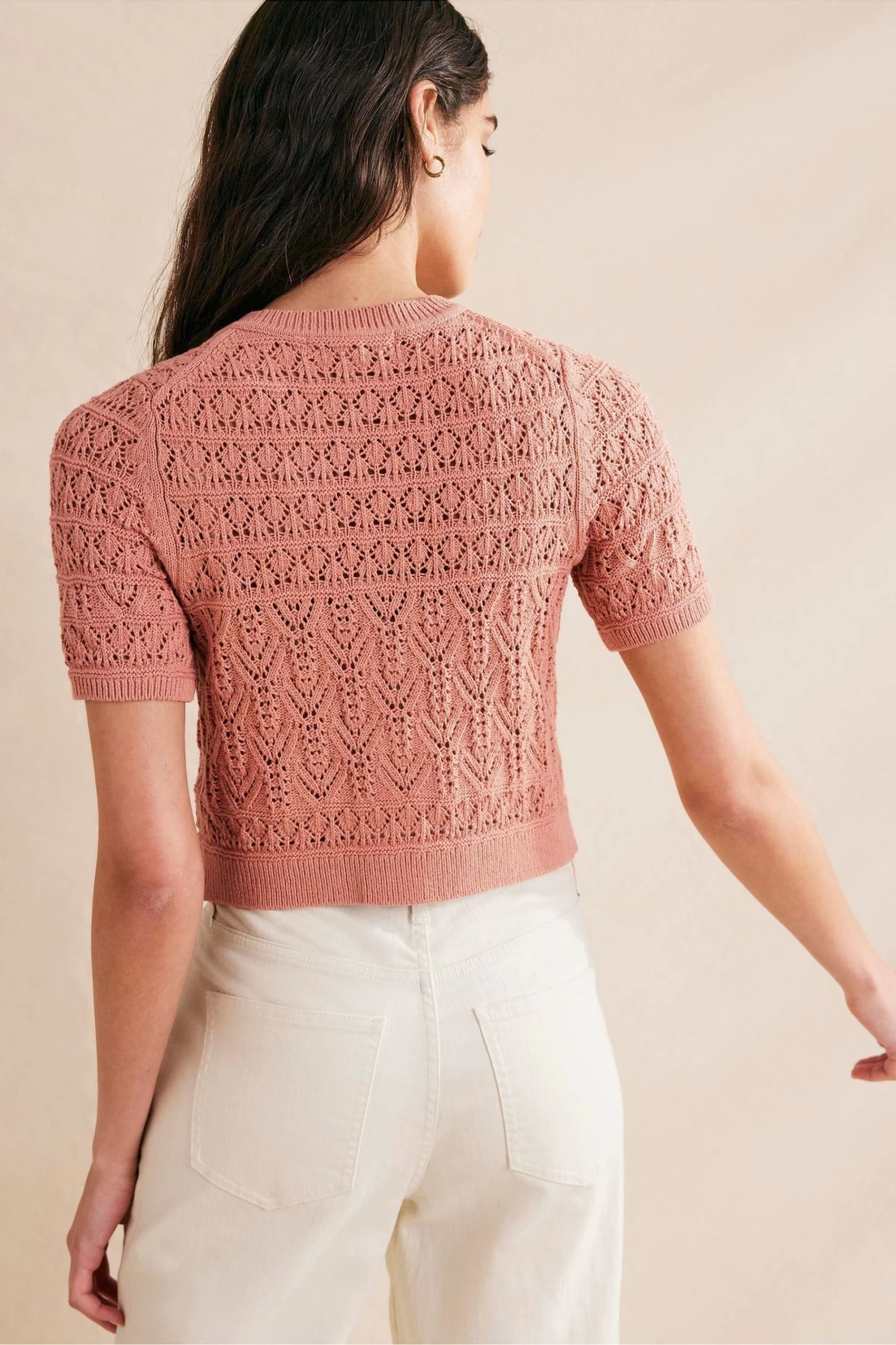 Boden Pink Pointelle Crew Neck Cardigan