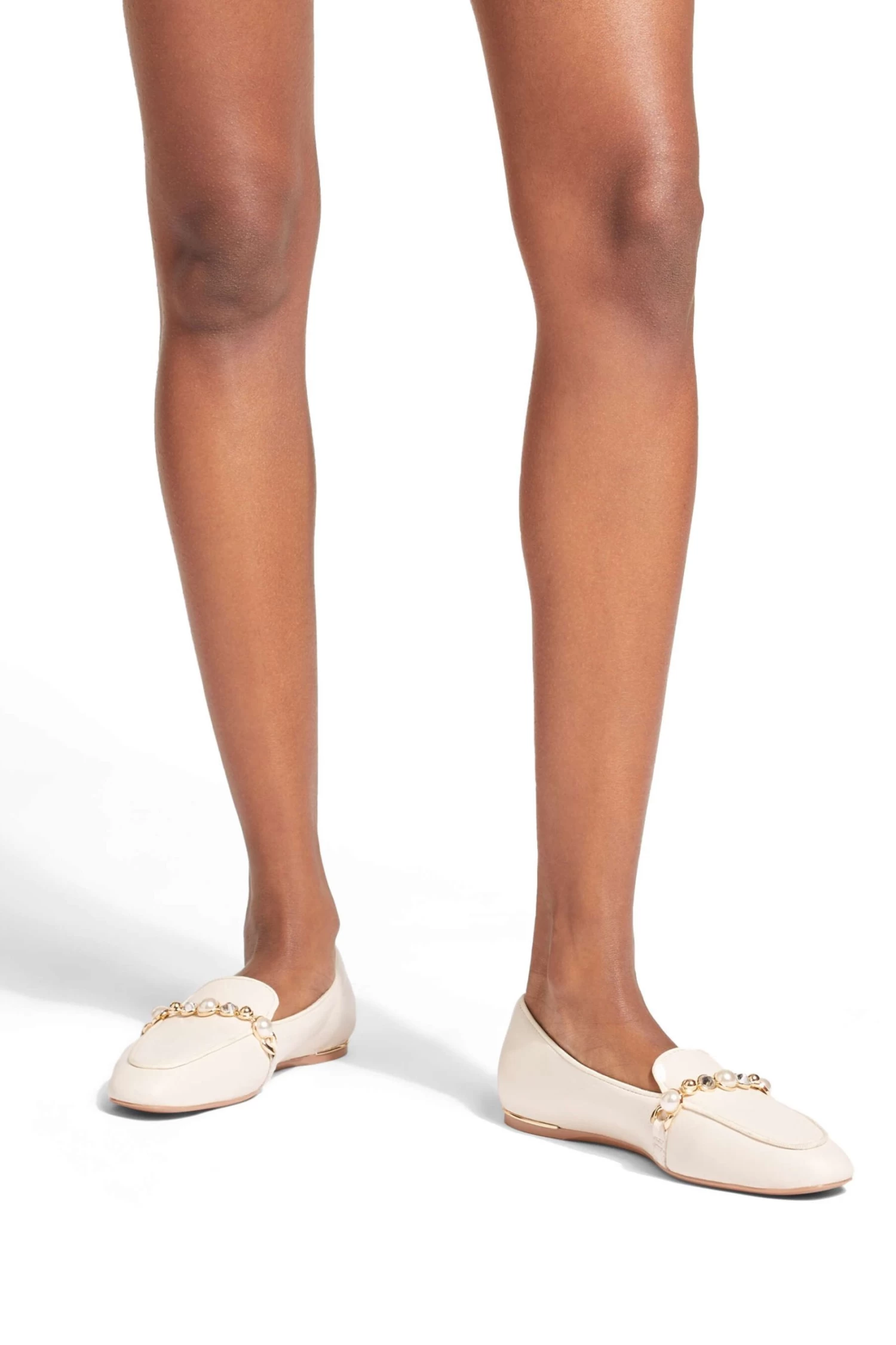 The Precious is a slip on loafer crafted in beige. There is a statement strap across the foot with large faux pearls and crystals.