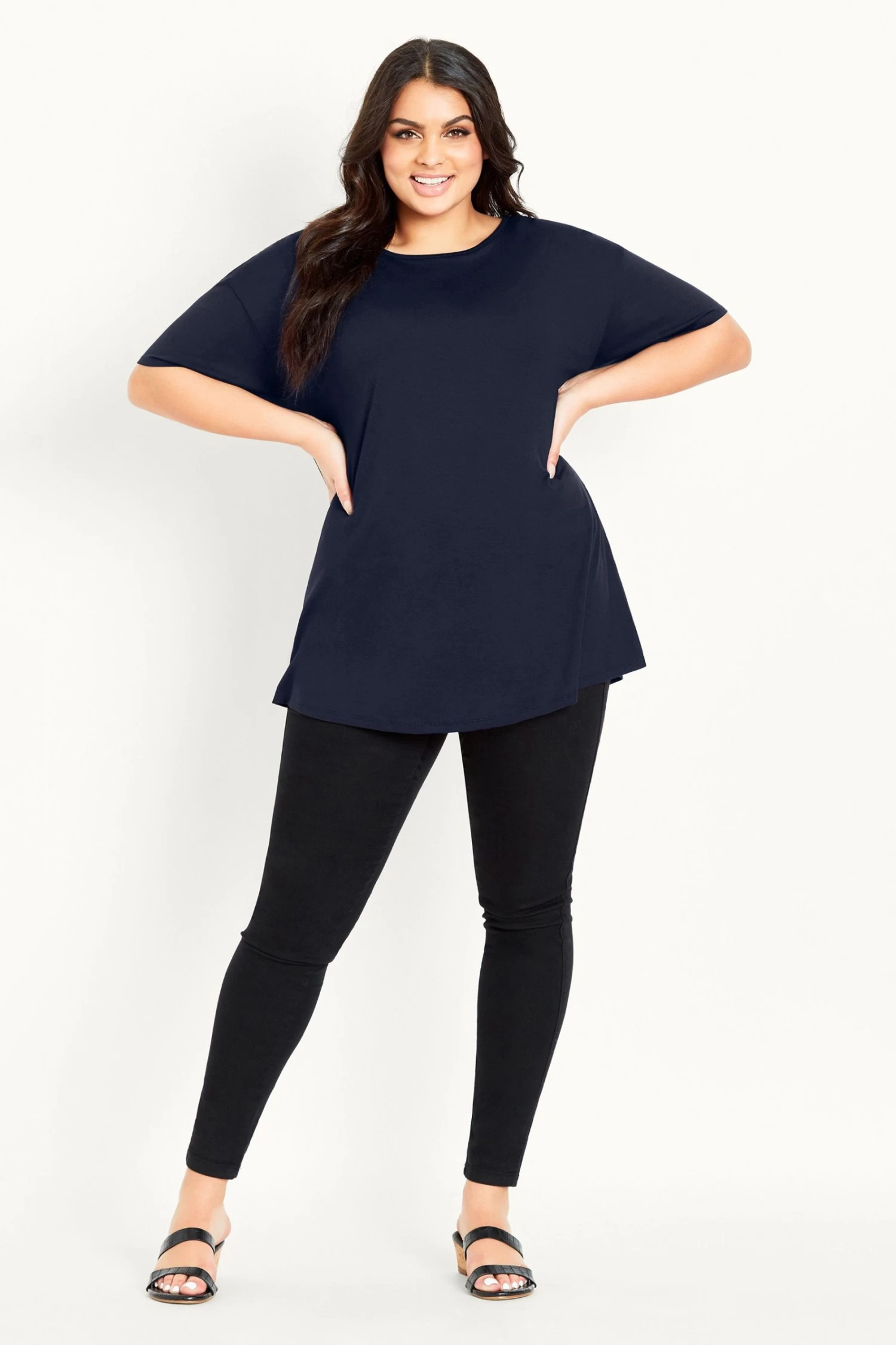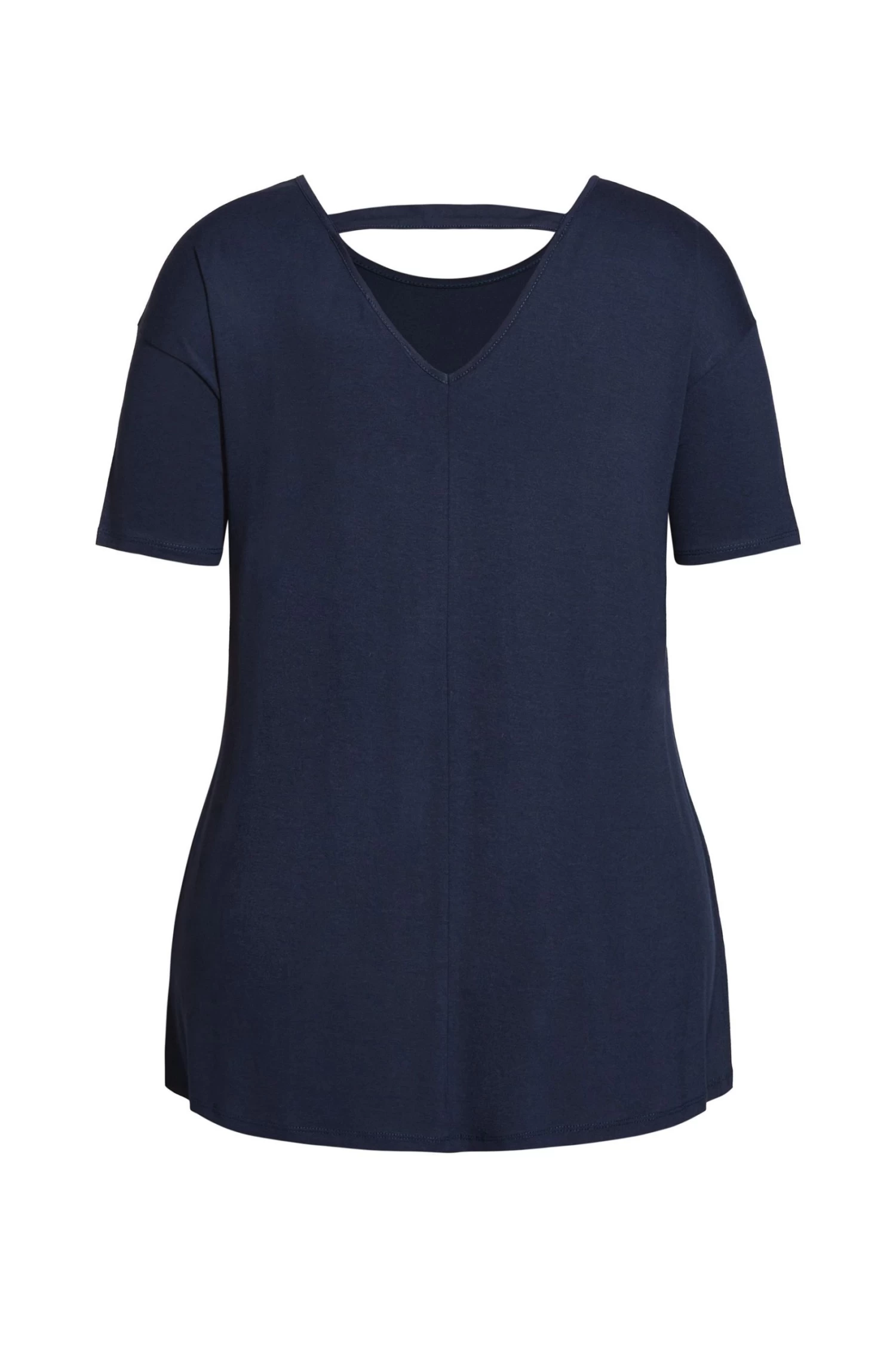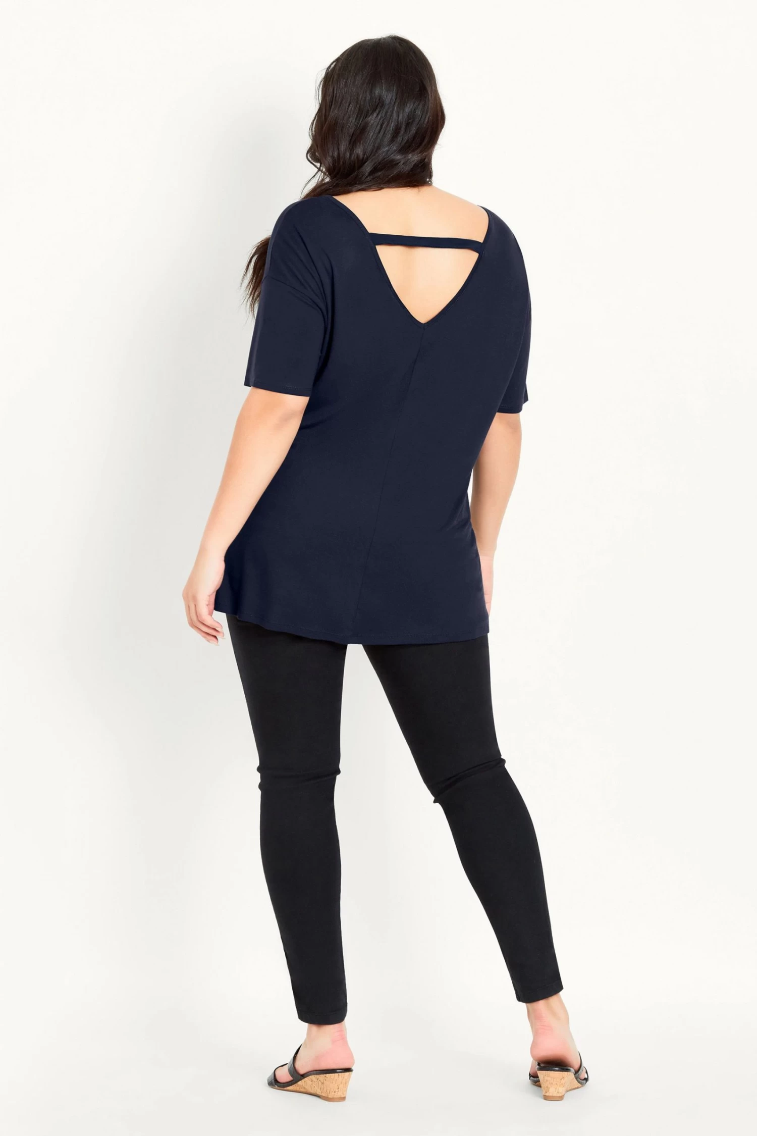 Cool, casual and staple, the bar back top brings added style to your laid-back weekend rotation. This tee features a strappy back feature and soft stretch fabrication, as well as a relaxed fit and short sleeve coverage. Key Features Include: Round neckline, short sleeves, strappy back feature, soft stretch fabrication, pull over style, relaxed fit, unlined, hip length tuck into a pair of high waist denim shorts, finishing with flatforms and cat-eye sunglasses for summer.