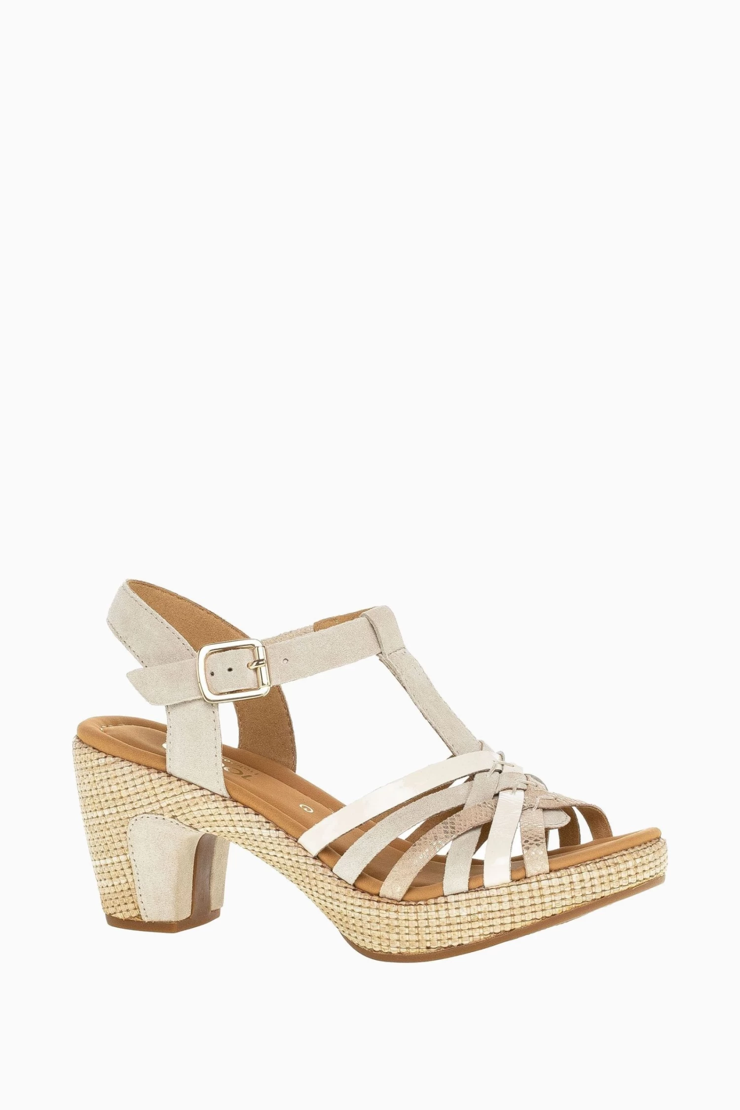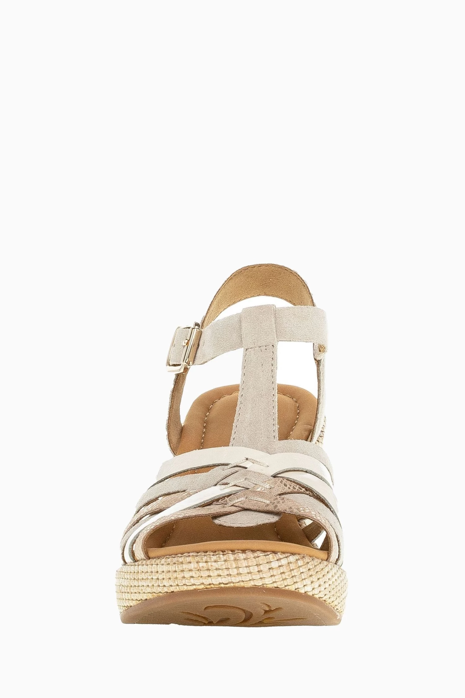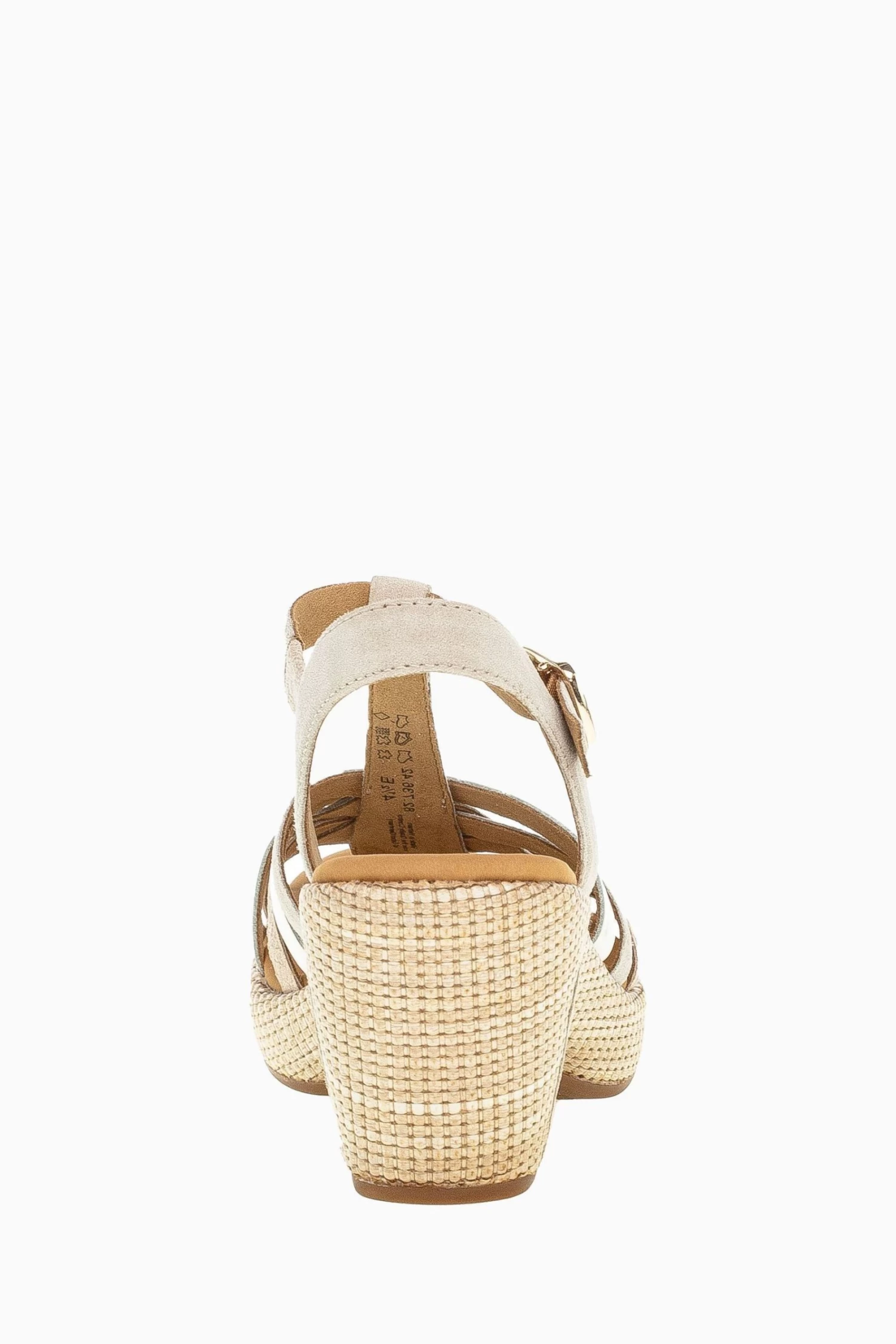 Gabor leather material mix combination strap sandal with a buckle fastening and Raffia covered heel in a D fit.