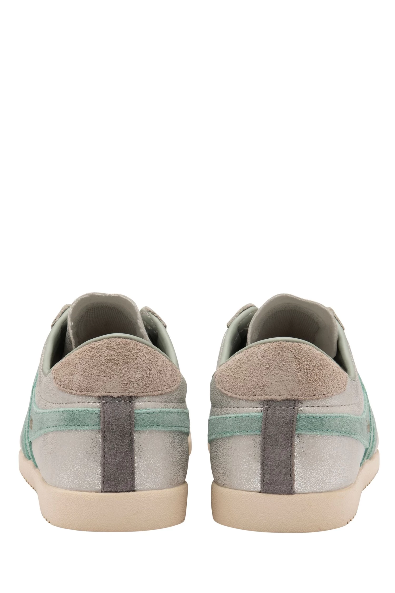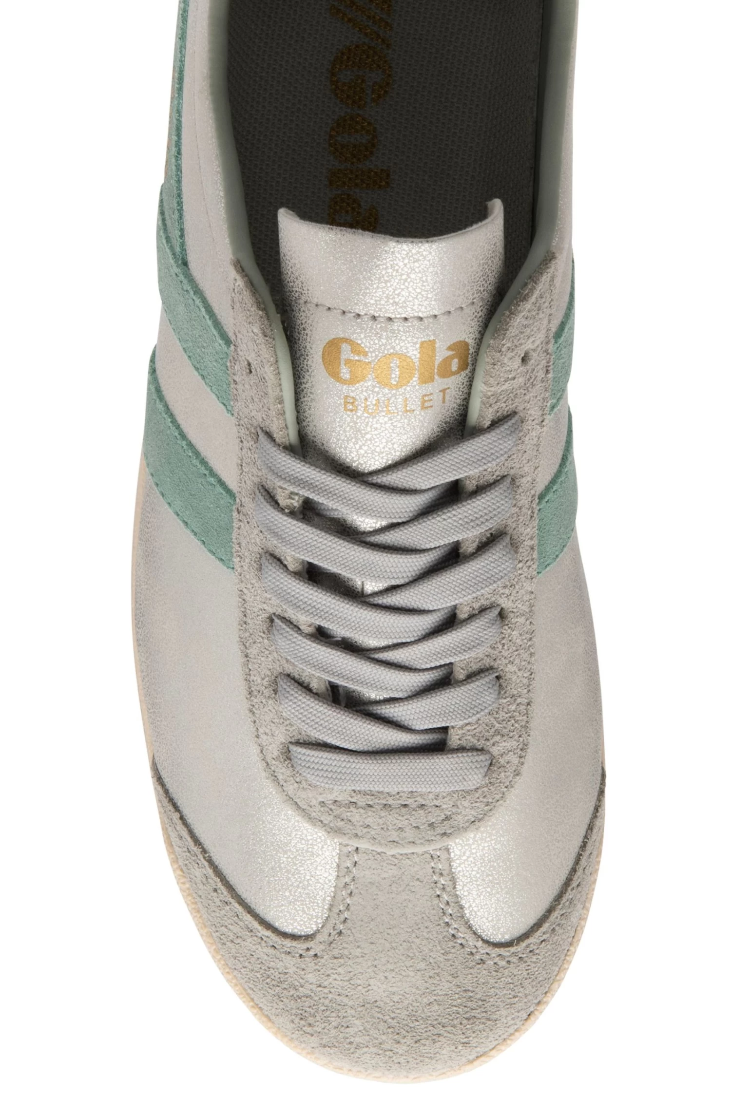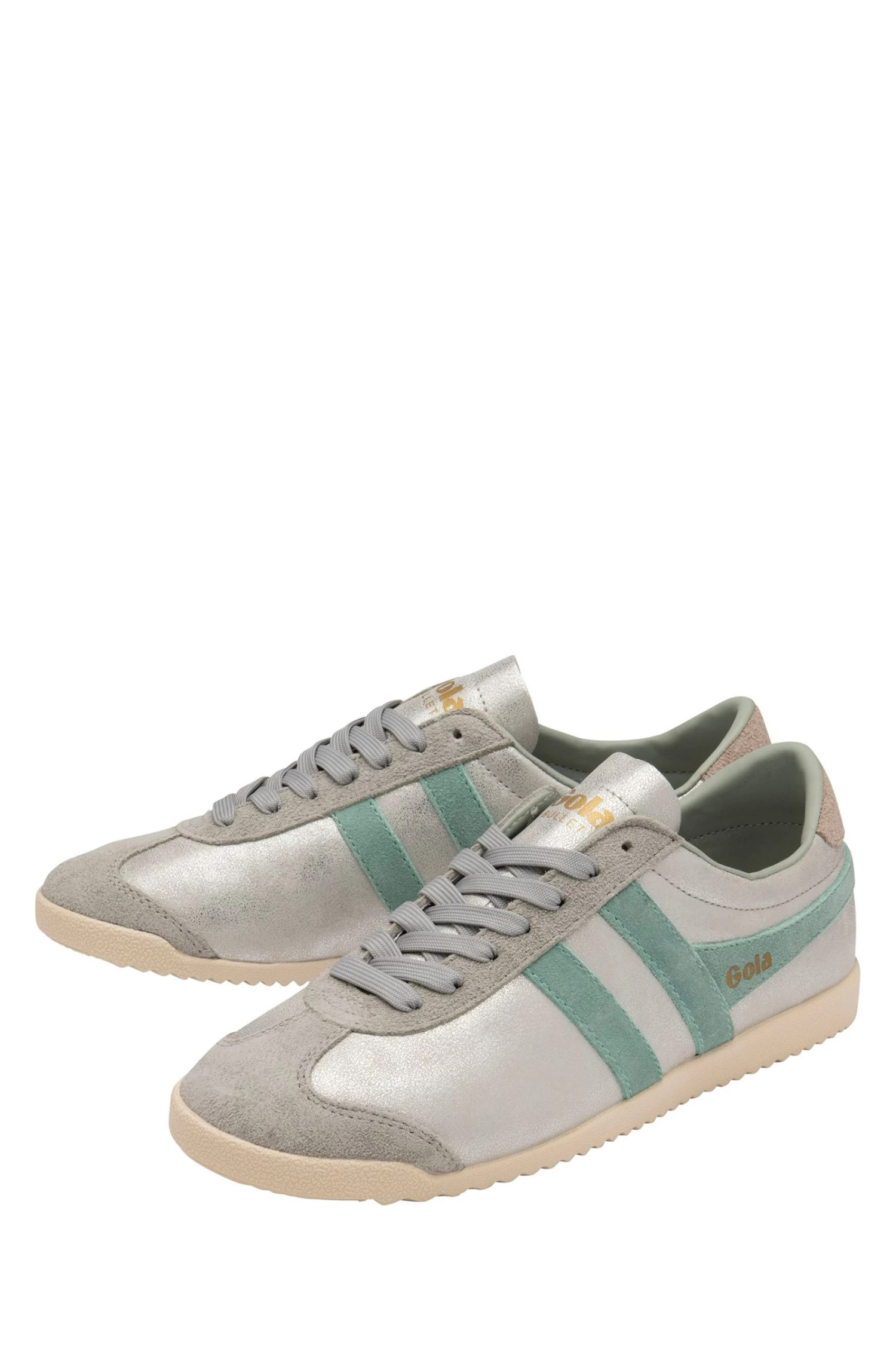 Gola ladies’ Bullet has been given a metallic update in the form of Bullet Blaze. Ladies’ Bullet Blaze features a muted silver upper, contrasting green mist wingflash, metallic heel tab and the iconic Gola branding to the side and tongue.