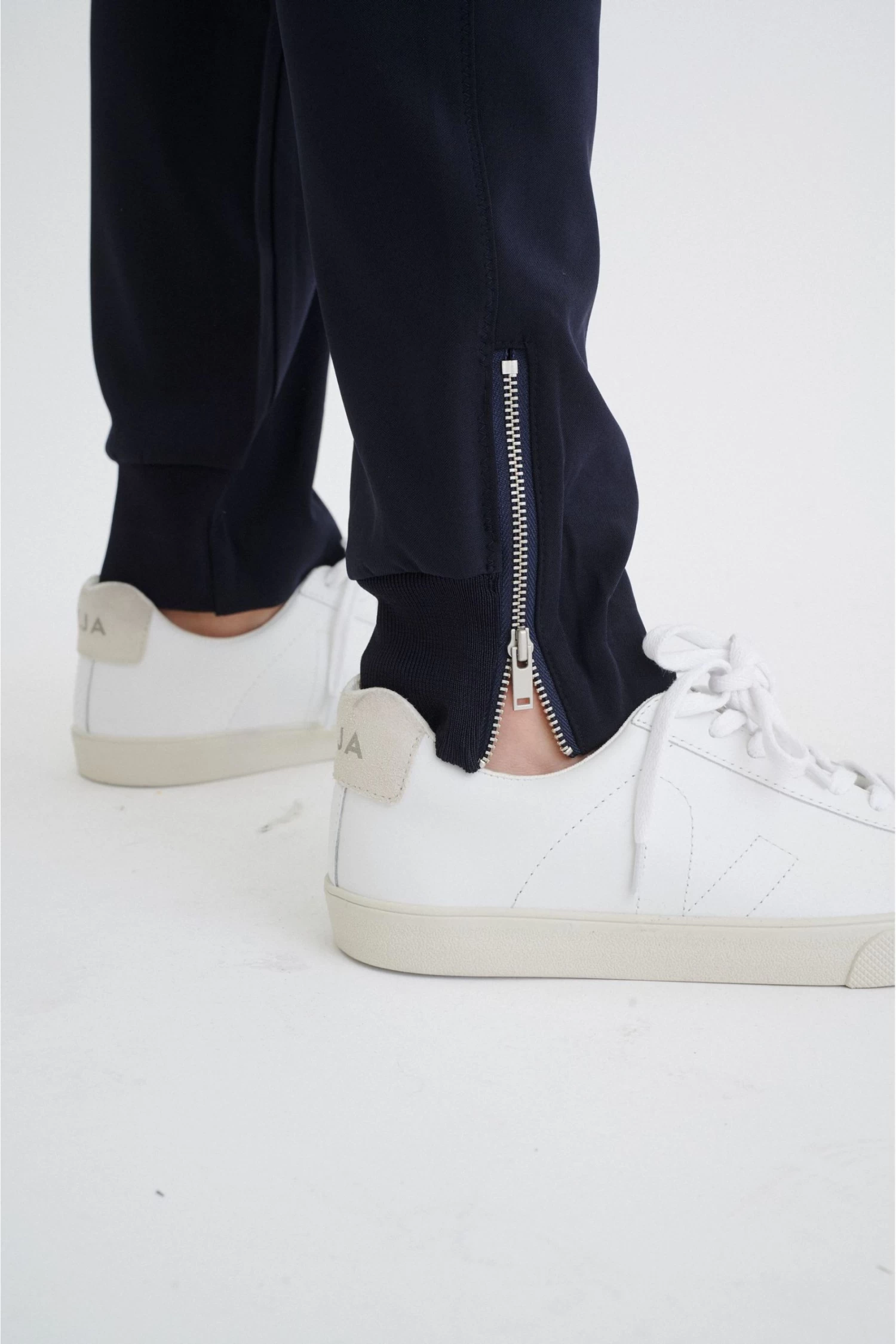 A loose and comfortable suiting pant with a regular waist and ankle length. Rib and zipper at the bottom.