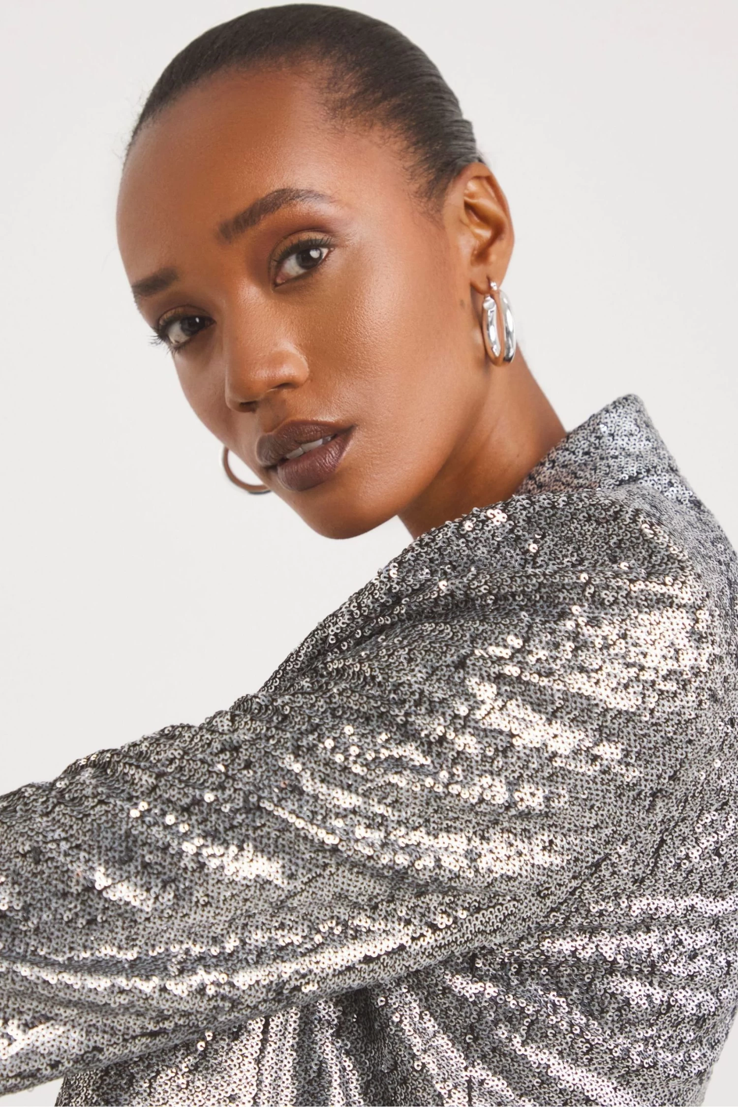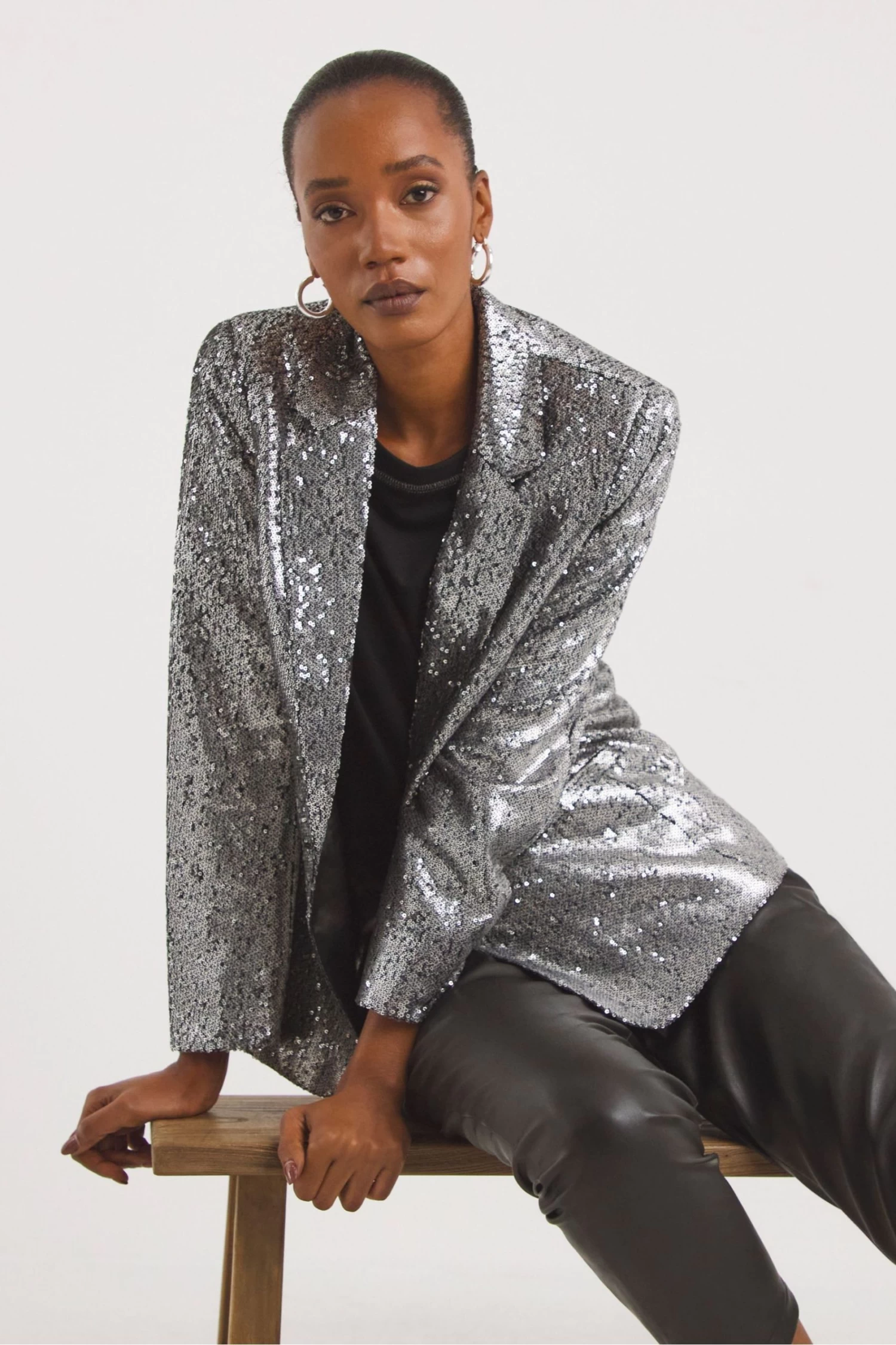 Add some glamour to your new season wardrobe with this silver sequin blazer. Cut to a relaxed single-breasted silhouette, this blazer features front flap pockets, a single mock horn button fastening, and notched lapels and is fully lined in a black, luxe satin lining for additional comfort and structure. Button up to flatteringly shape the waist or wear open to create a relaxed silhouette paired back with your new season wardrobe to effortlessly take any outfit from day to night.