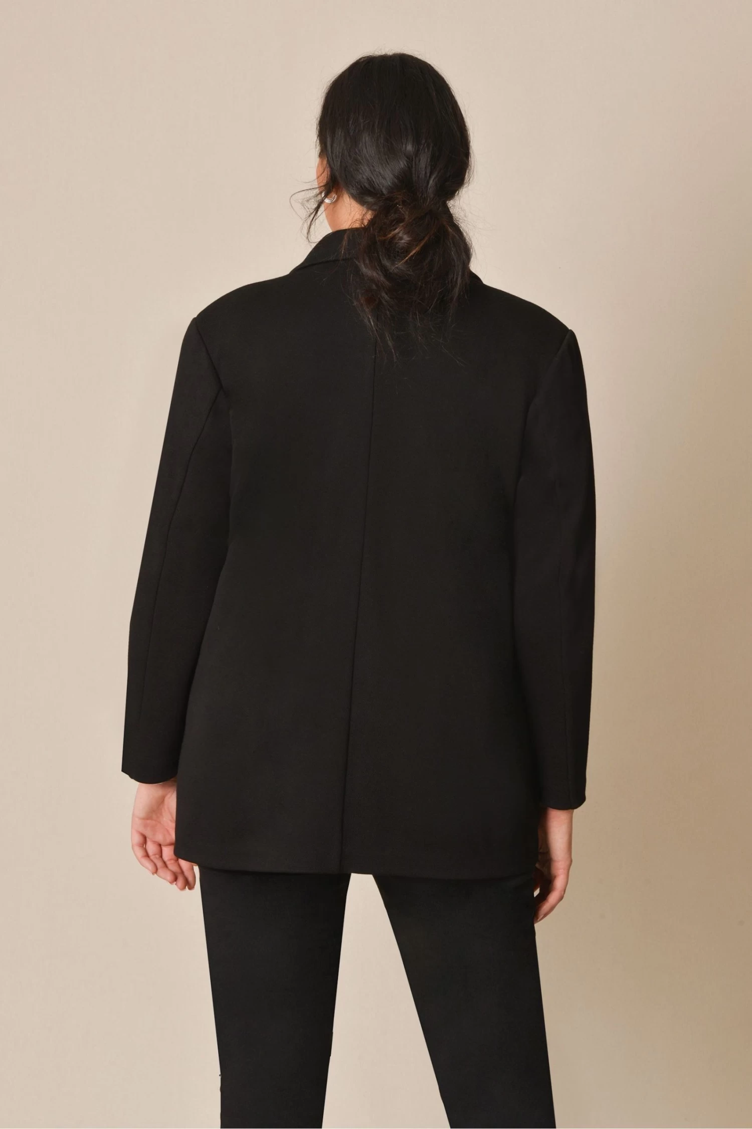 In a beautiful heavy jersey in timeless black, this blazer has a contoured, longline shape that’s designed to flatter. Fully lined in black satin, it includes all the classic single-breasted blazer tailoring including a revered collar, long sleeves and front pockets, and is the perfect piece to wear with anything from jeans to smart trousers.
