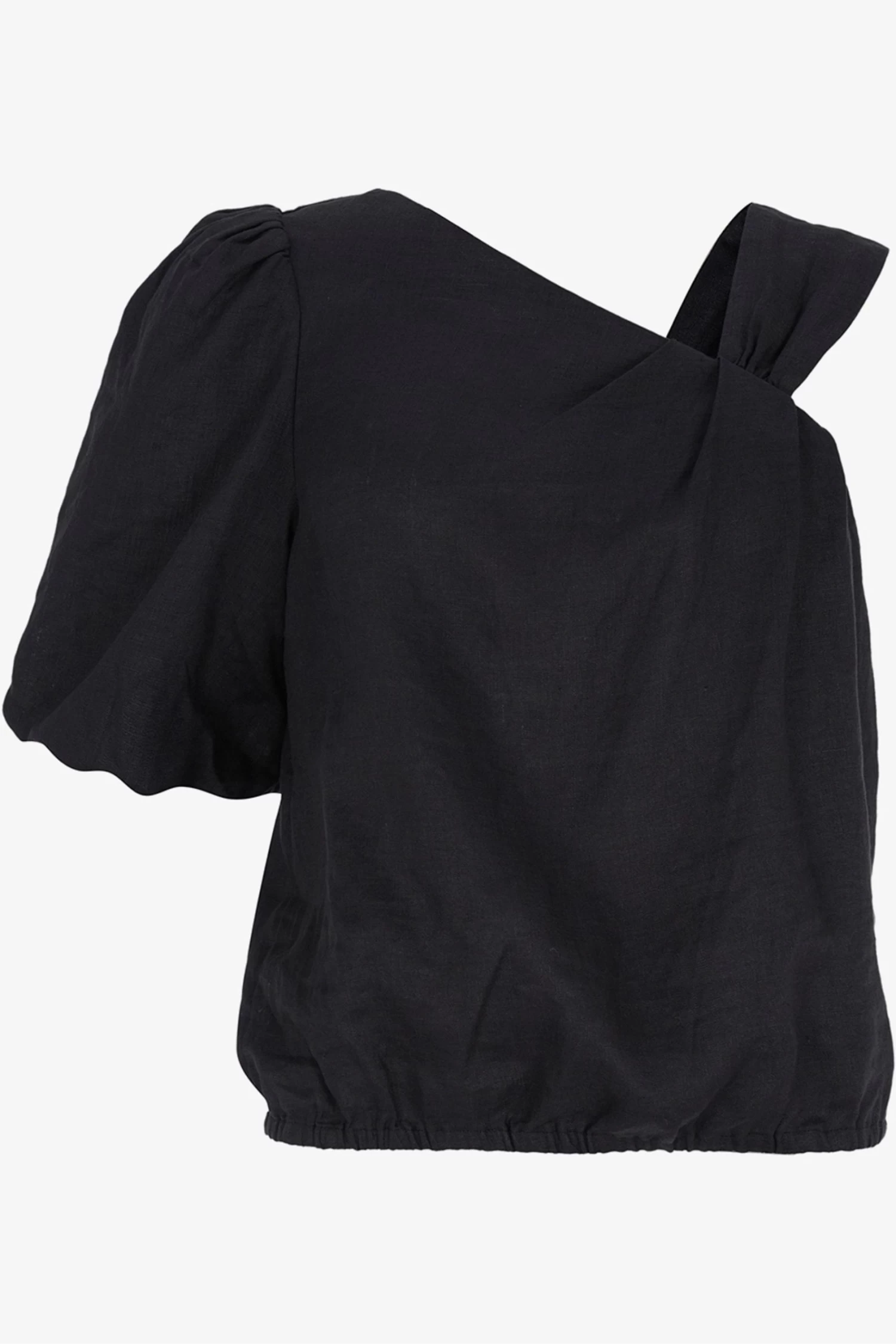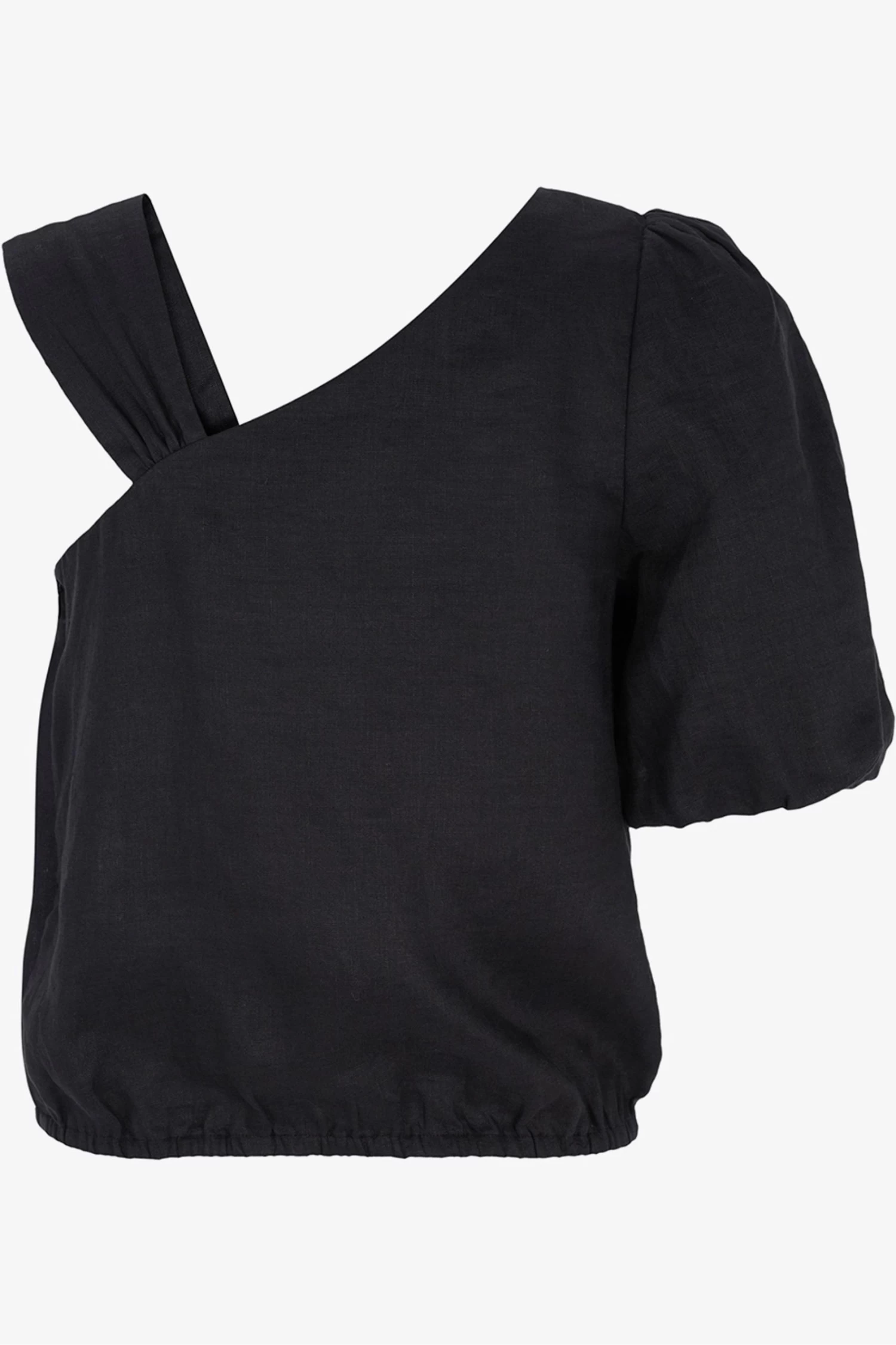 Cut in a flattering, one shoulder neckline with a puffed sleeve, this black asymmetric top is the perfect party-season plus one.