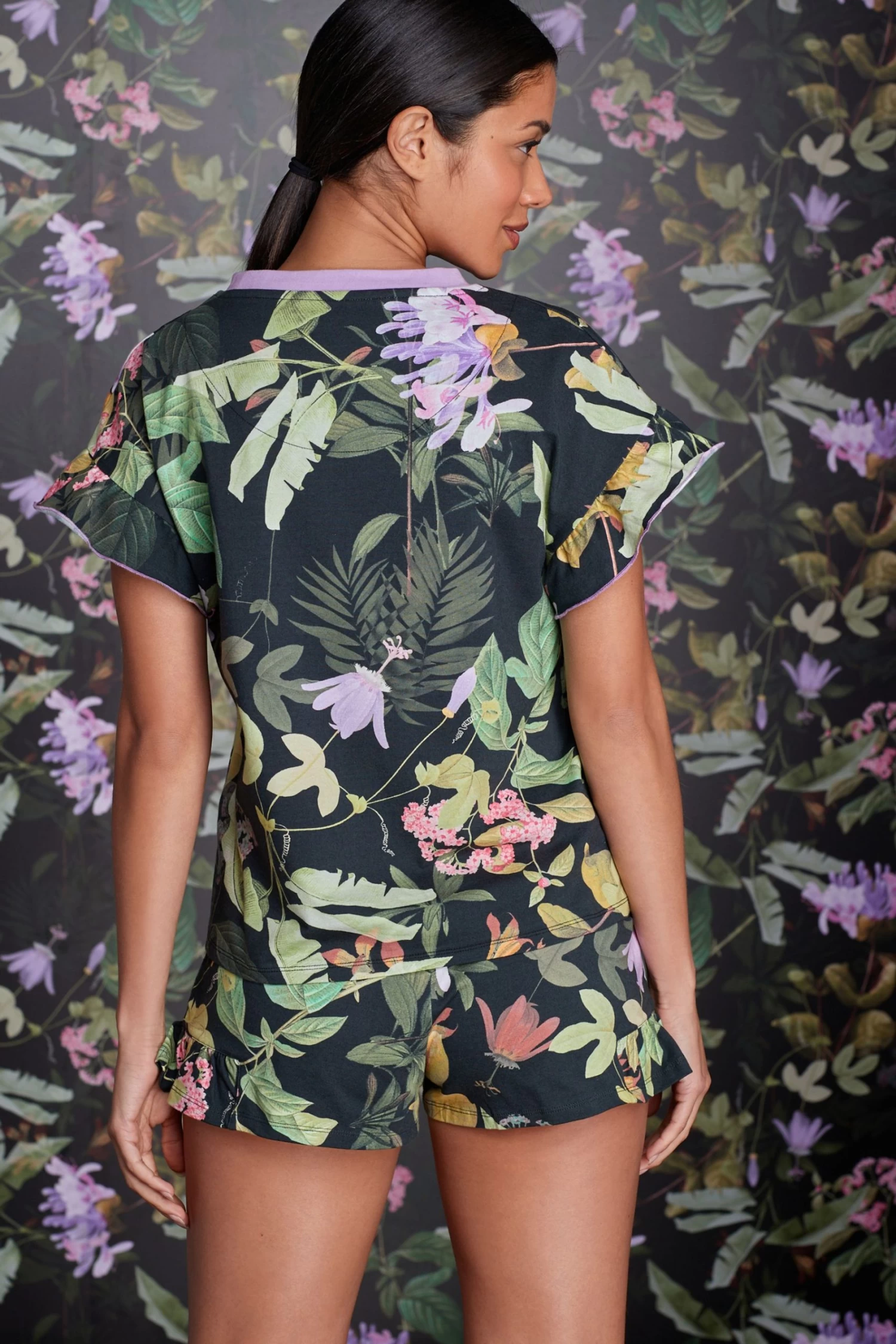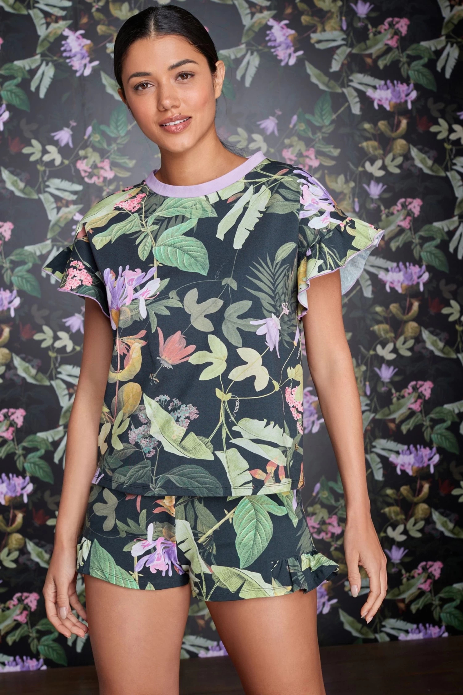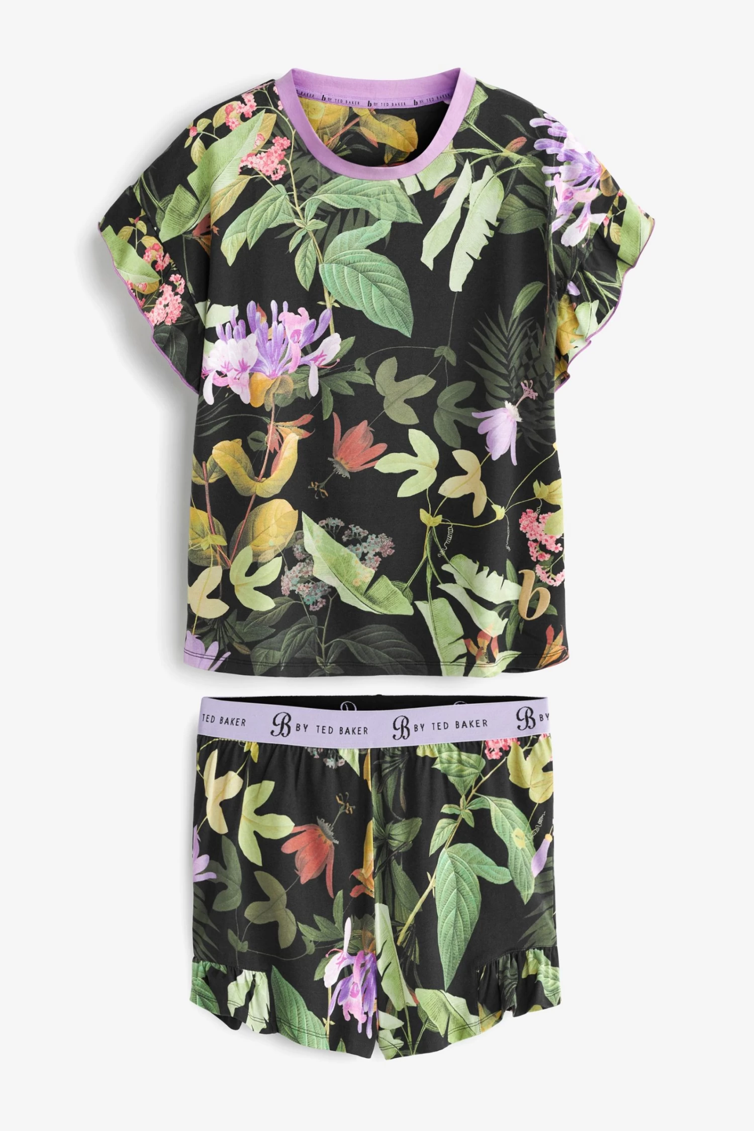 Adorned with an exotic floral print these B by Ted Baker PJs will keep you cool and comfortable for bedtime. The top features a contrast neckline and frill sleeve while the shorts have a branded elasticated waistband and side frill detailing.