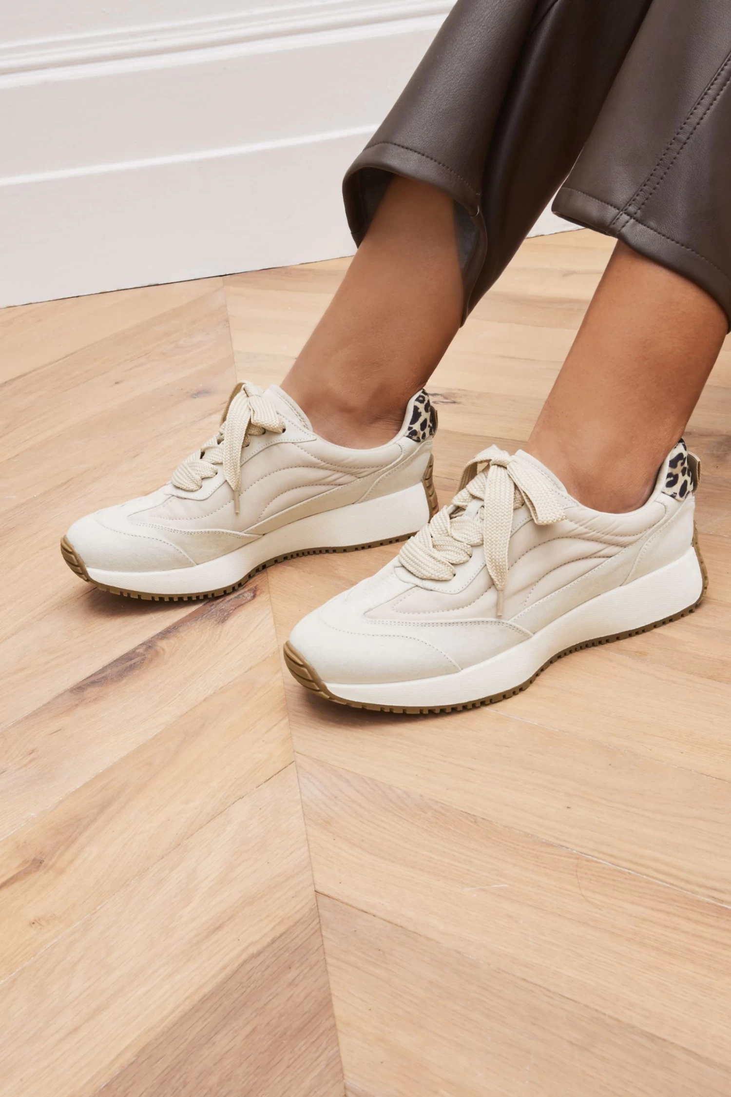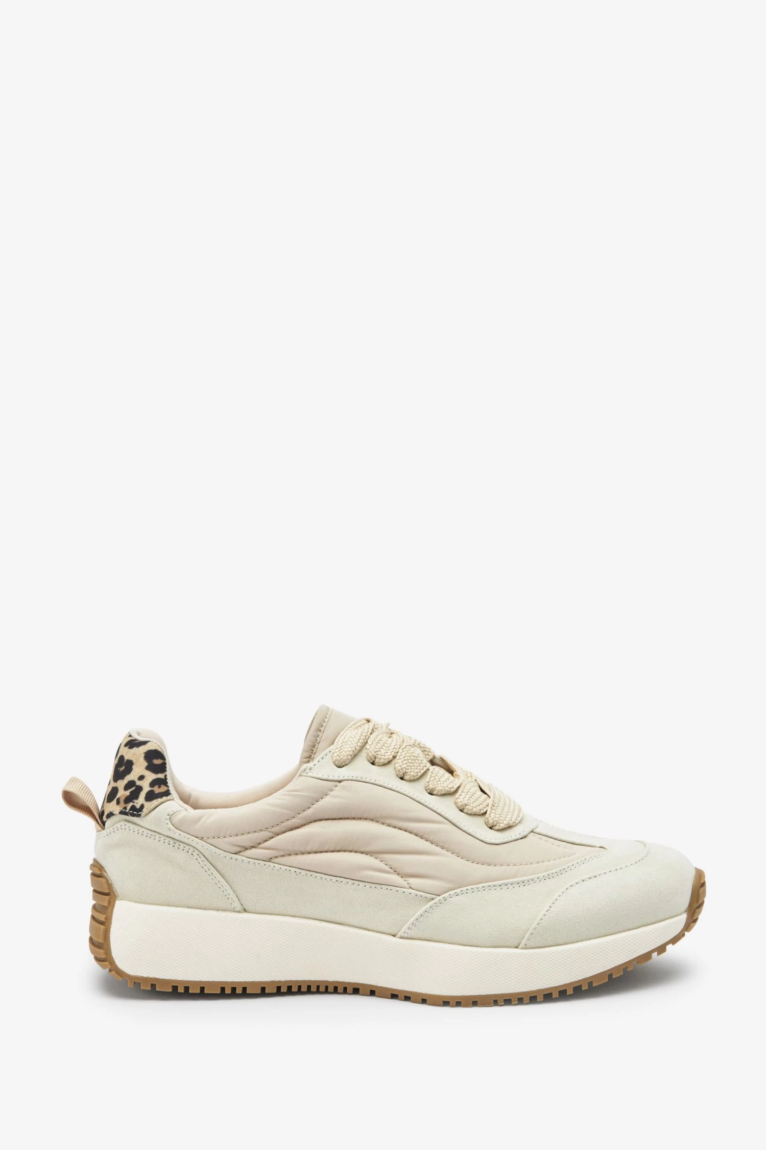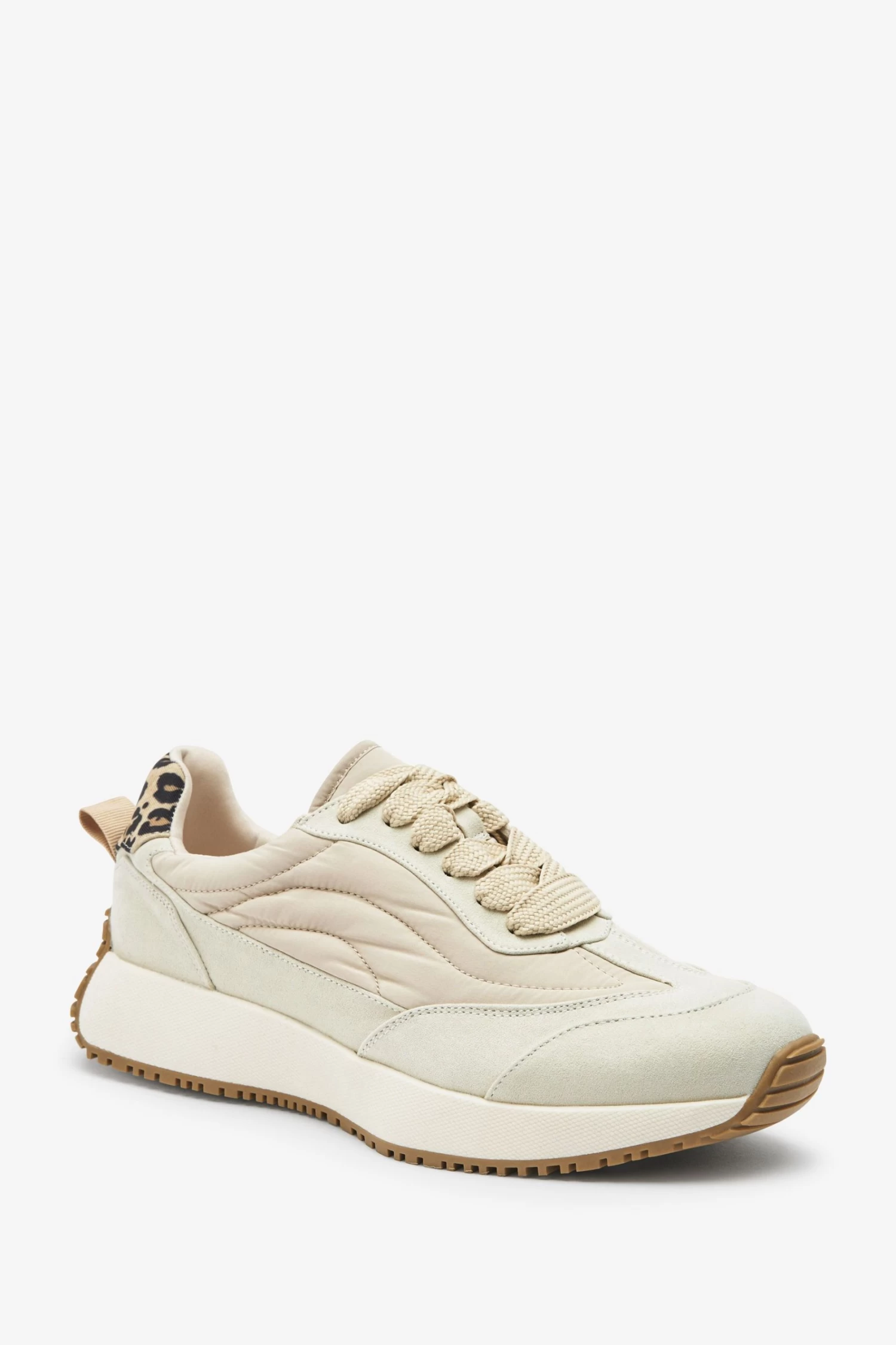 Luxe up your off-duty look with our sleek and stylish trainers. Cutting a classic silhouette, the chunky off white trainers also feature traditional laces, a leopard print heel tab detail and are designed with a Forever Comfort foam padded sole for your supreme comfort throughout the day. Pair these eye-catching shoes with leggings and a sweatshirt for a great weekend look.