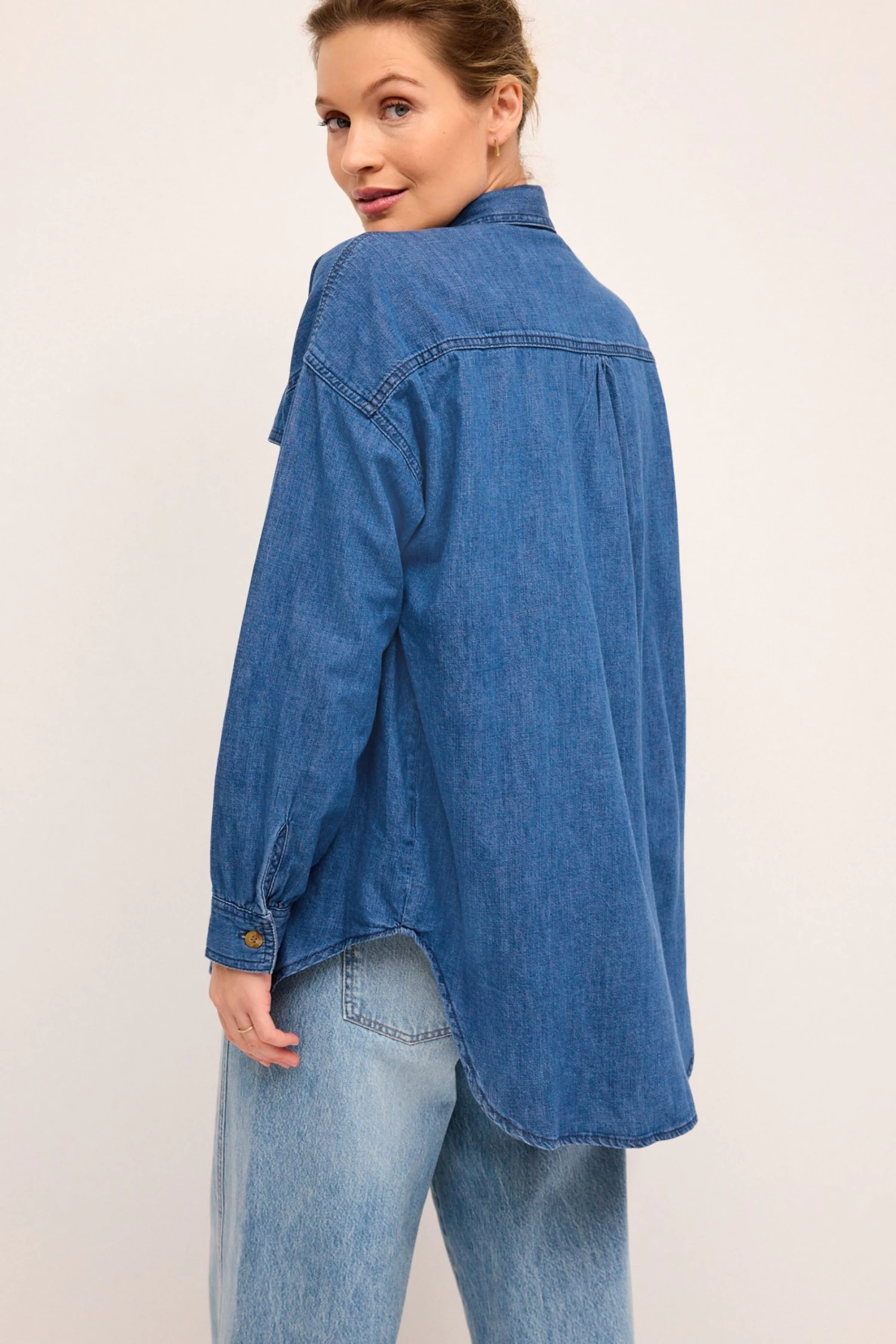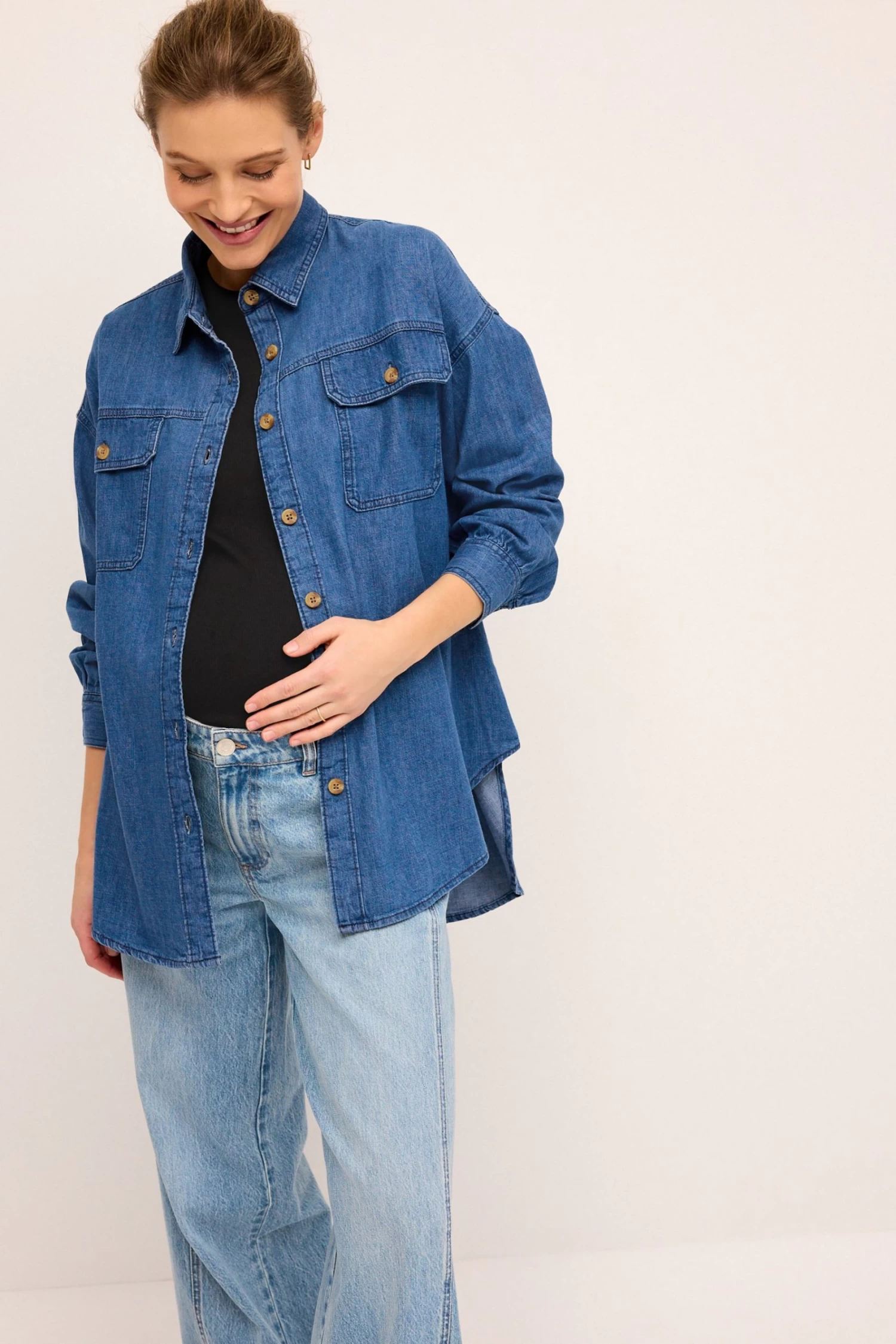 This oversized denim shirt is perfect for wearing both during and after pregnancy. Button front shirt detail makes nursing easily accessible.
