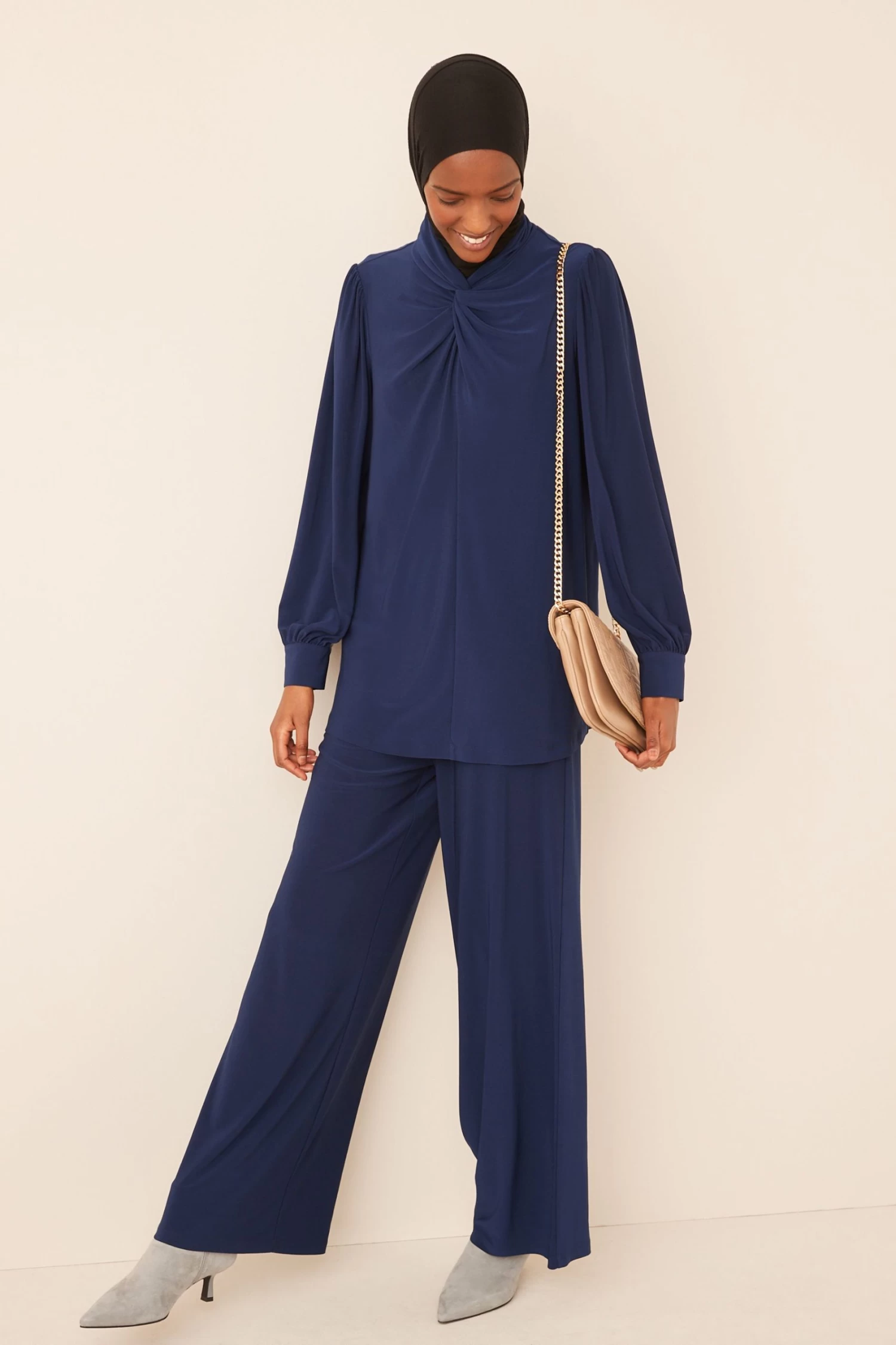 Made in a super soft stretchy fabric that doesn't cling, this high neck with a twist detail top features a full-length sleeve and is designed with a modest approach in mind. Matching trousers available. Part of a co-ord.