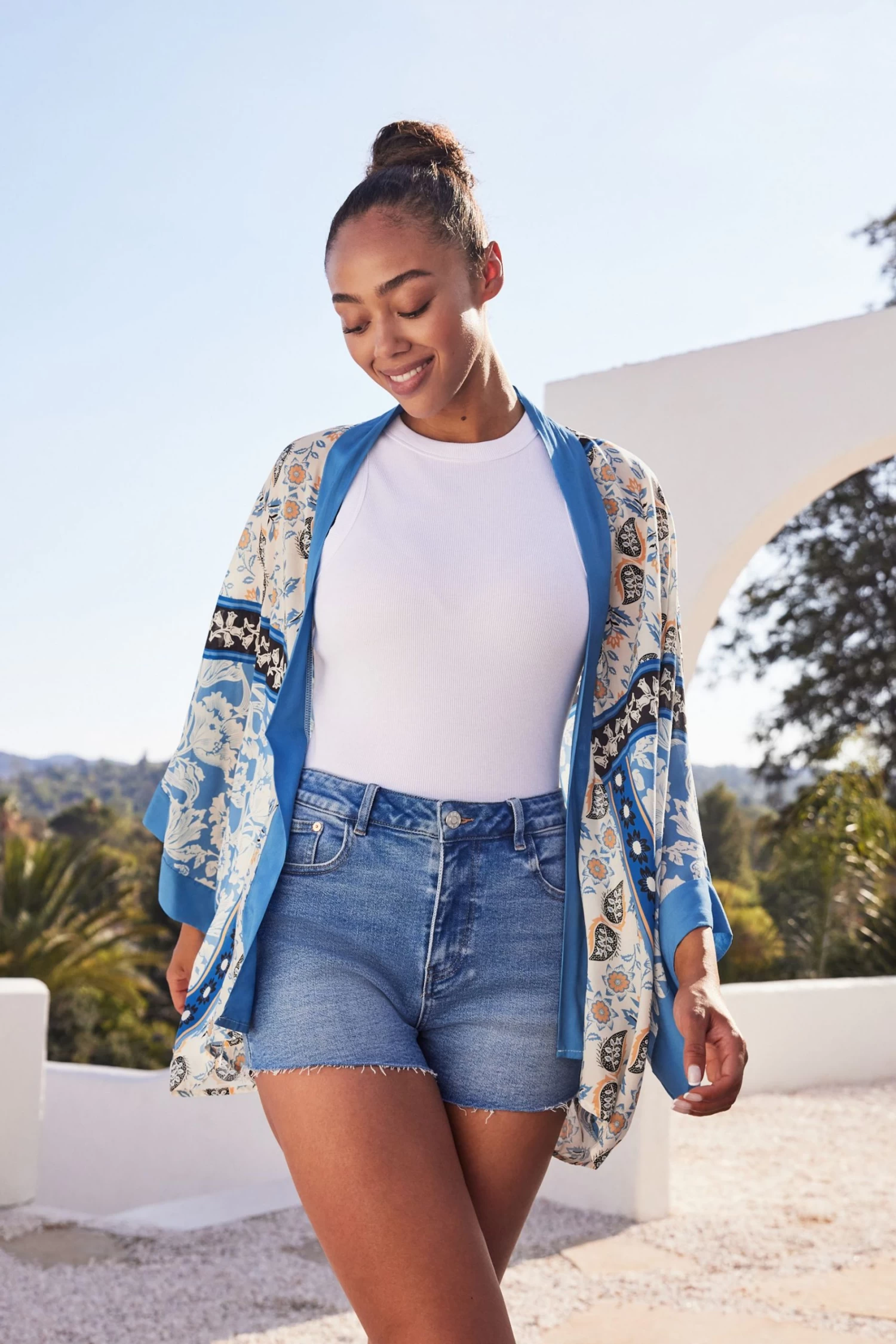 Our printed kimono is a stylish cover-up for days on the beach or out exploring in the sun. Made from a lightweight viscose with wide sleeves and covered in a pretty tile print in shades of blue and yellow, this fashionable and functional piece will be a holiday staple.