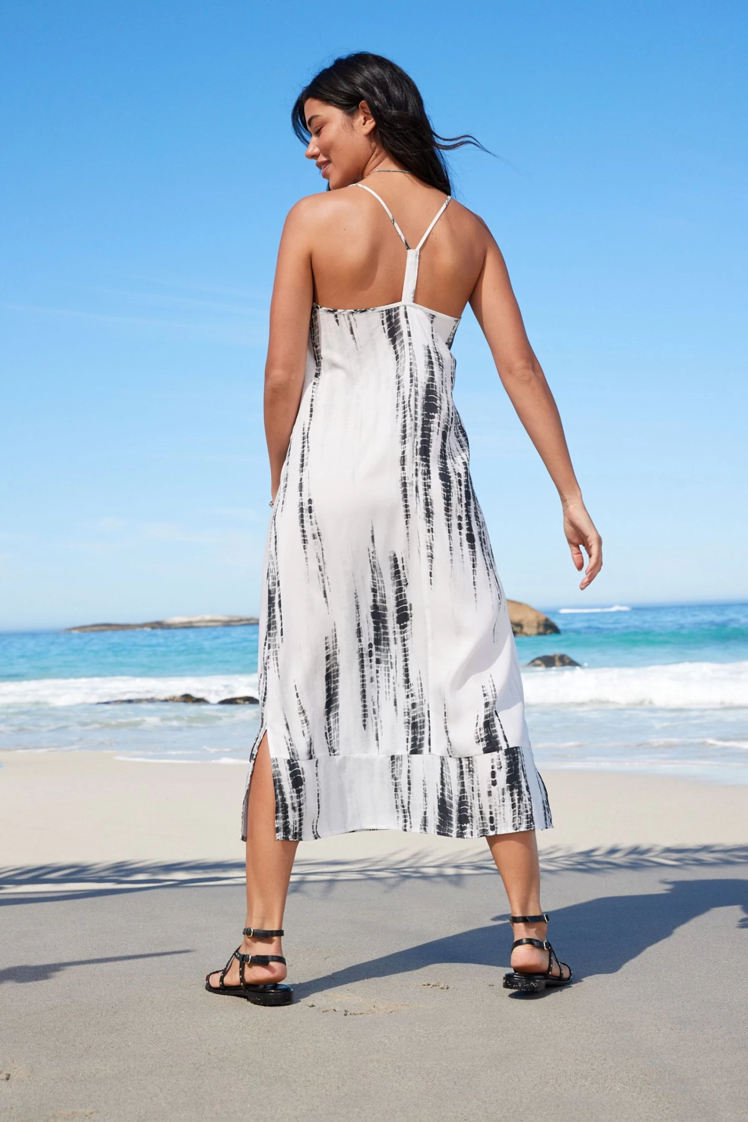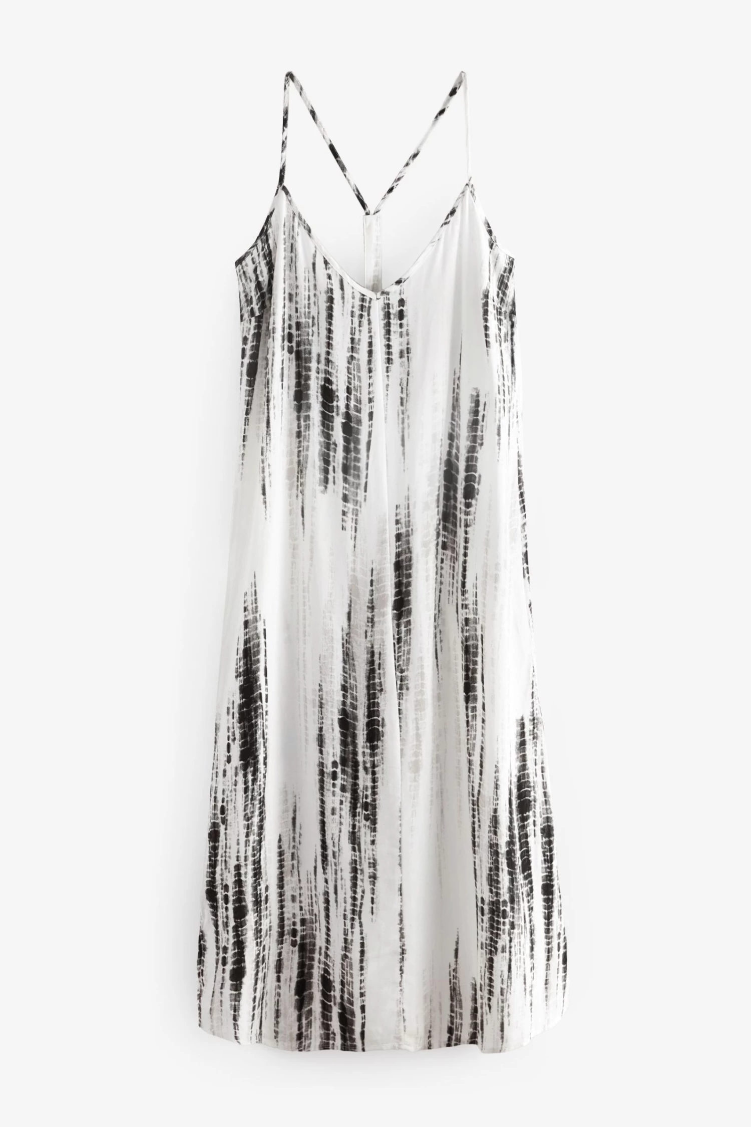 Looking for the perfect dress to slip into? Slip dresses have stood the test of time and have proven themselves as true wardrobe staples and our midi slip dress is no exception. Designed in a floaty fabric with a gentle v-neckline and unique racer-back style straps. Perfect for wearing under an oversize chunky knit or on its own with a dramatic statement heel. This is a dress that goes beyond your ordinary basic and allows you to build your own aesthetic around it. Embrace the trend, but do it your own way.