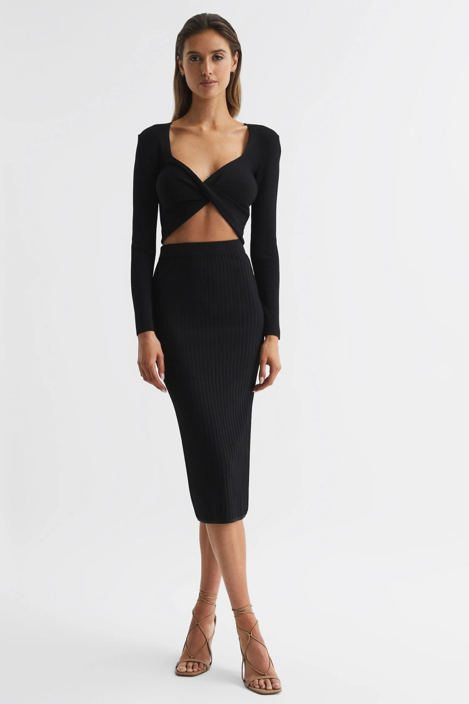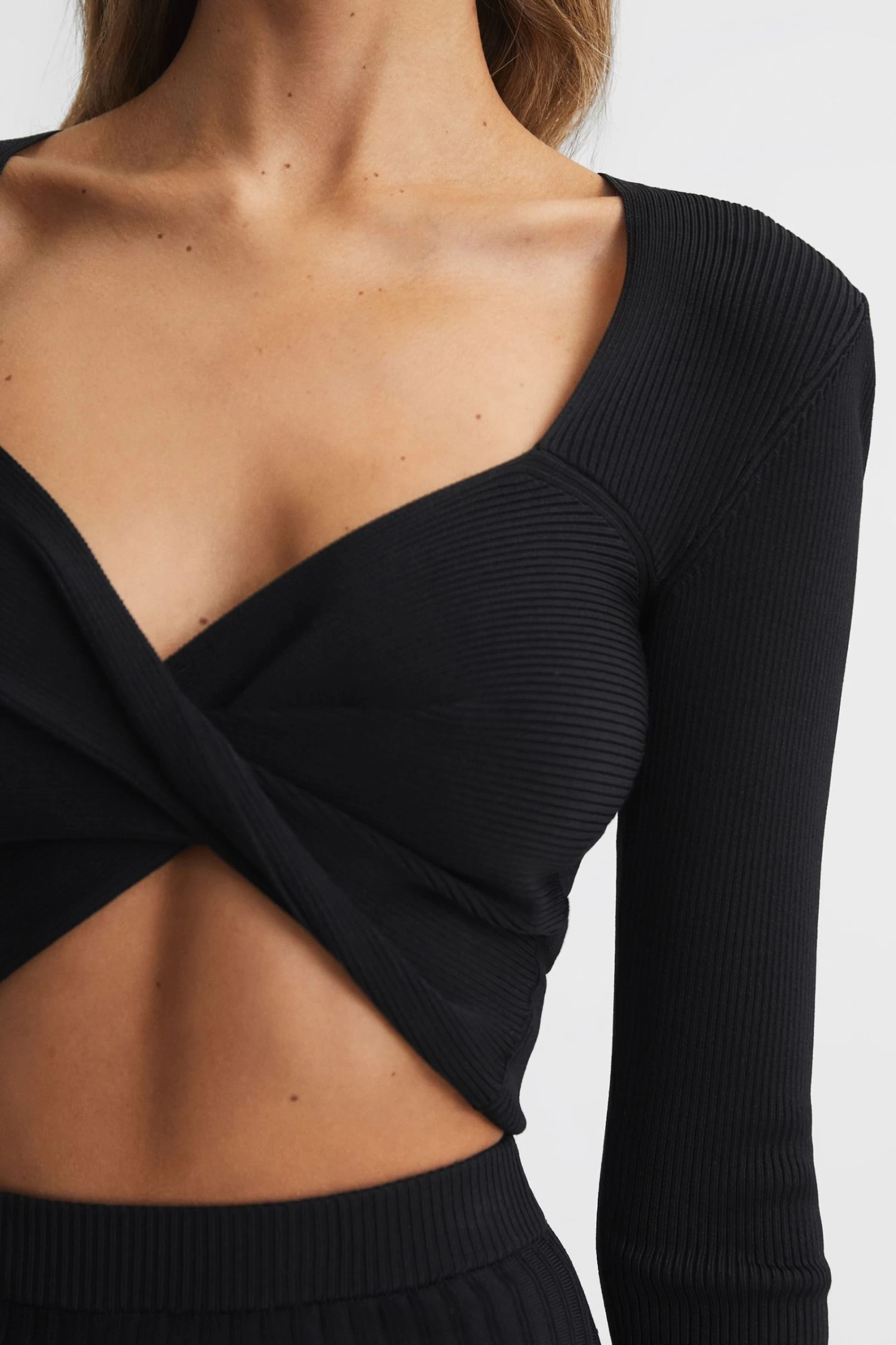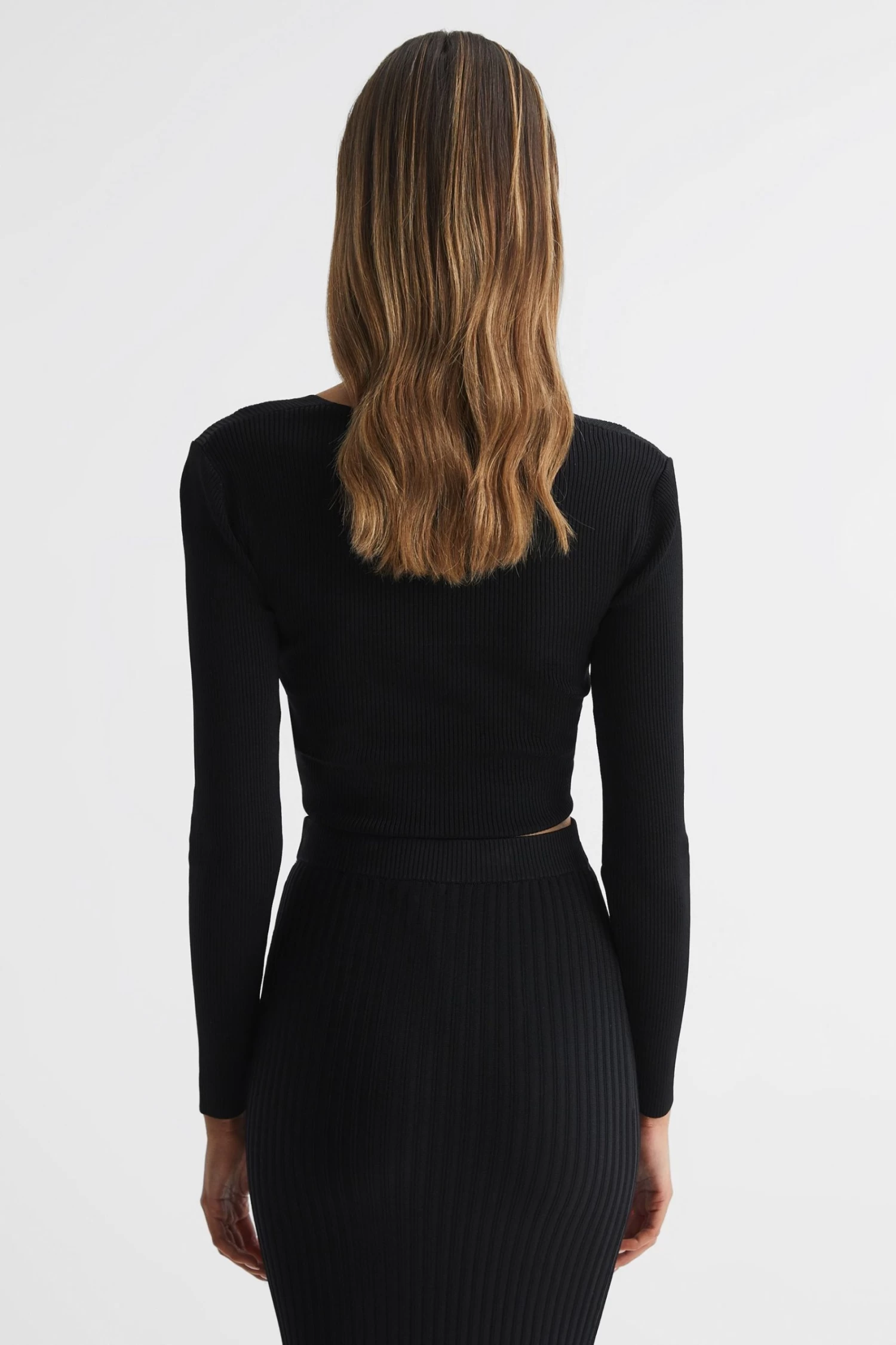 The black Iona top is spun from a ribbed fabrication that hugs the frame through the arms and chest, smoothing the profile and finishing at a cropped length. Curate a sleek look by pairing with the coordinating skirt.