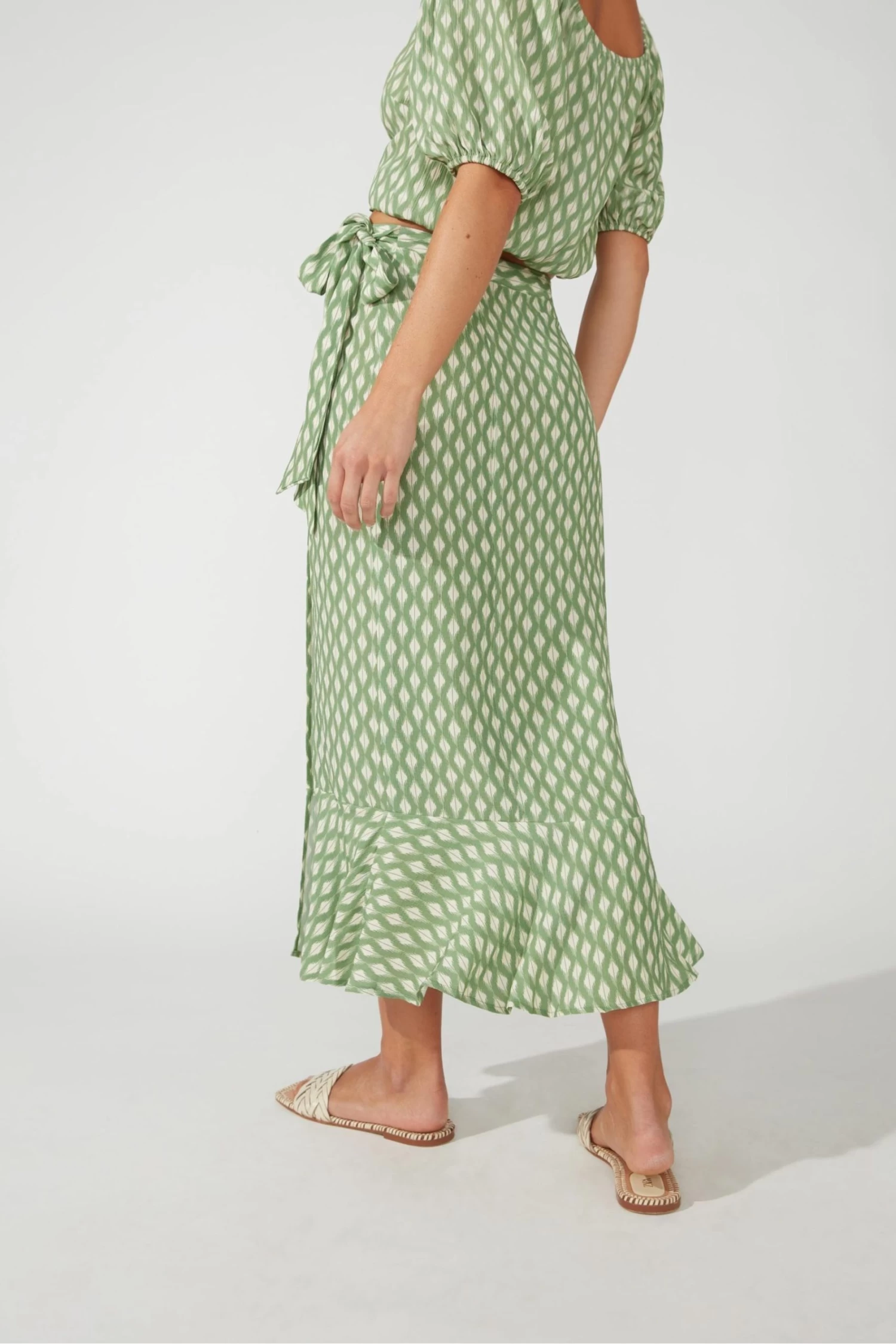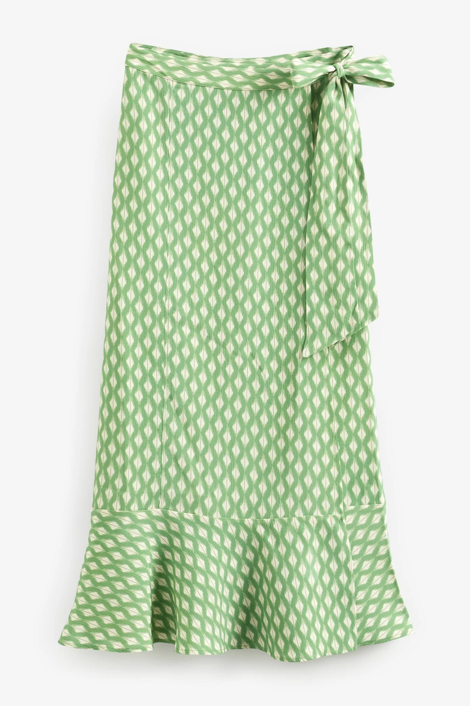 This skirt is a perfect spring item for the fashion-conscious individual seeking to make a statement this season with a contemporary geo print in a beautiful green. It exudes a sense of effortless chic in an on-trend wrap silhouette, featuring a soft feminine frill detail cascading down the front. Cut in a crepey handle fabric that is lightweight and breathable, perfect for daywear where you can easily pair with knits or plain white T-Shirt.
