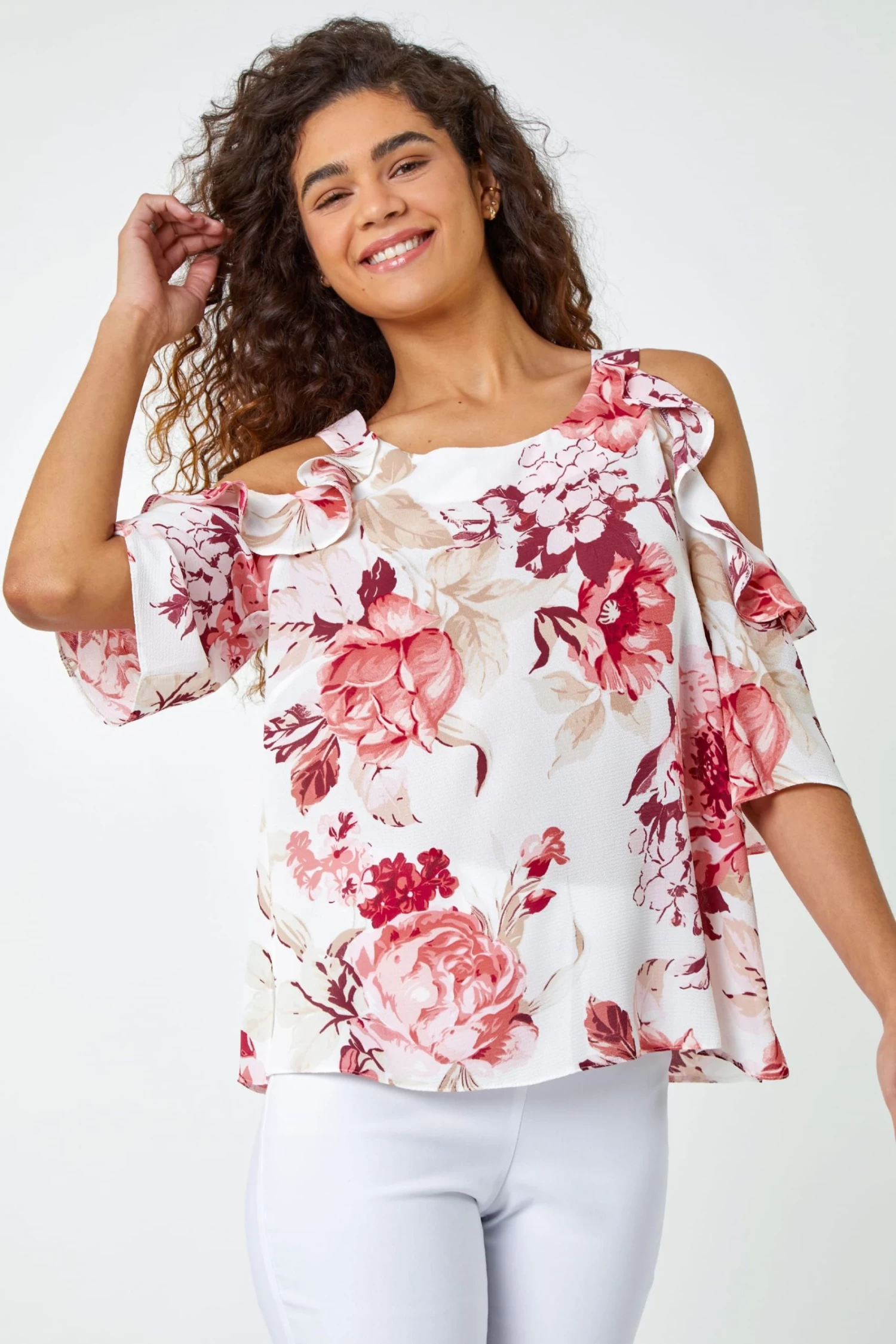 Roman Floral Print Cold Shoulder Frill Top
