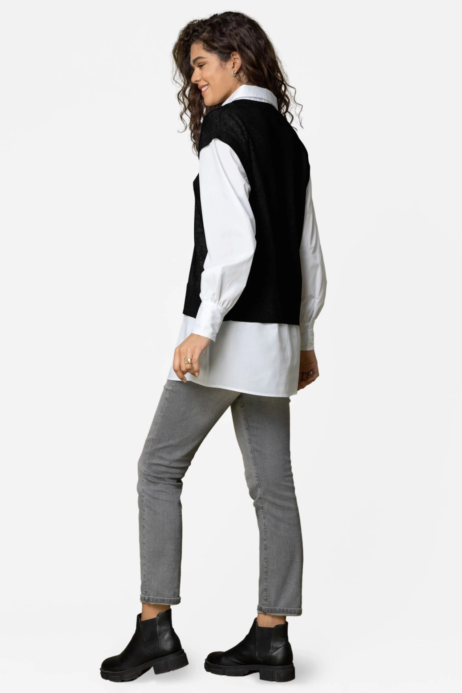 You ll be bang on trend with this knitted vest and white shirt combo! With the long sleeves and comfortable fit, this style can be worn throughout the whole season. The shirt collar and v neckline adds a classic smart casual vibe. Dress this up with faux leather trousers, or keep it casual with jeggings and boots.