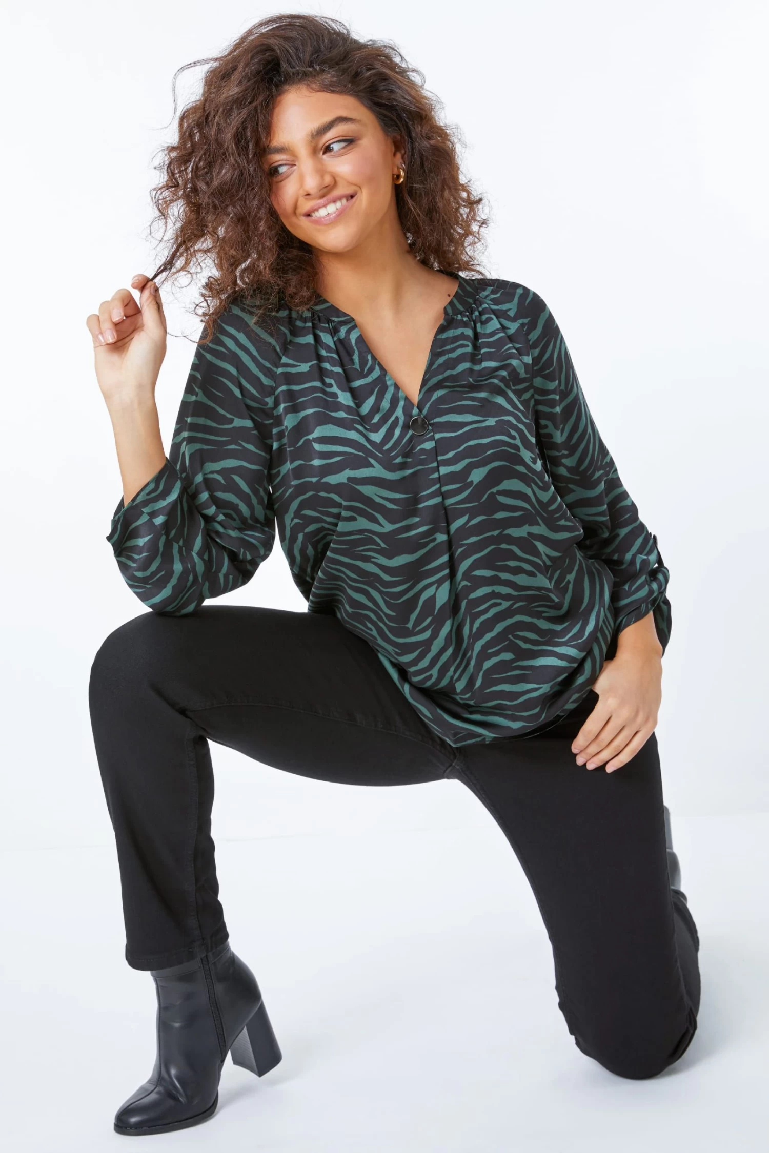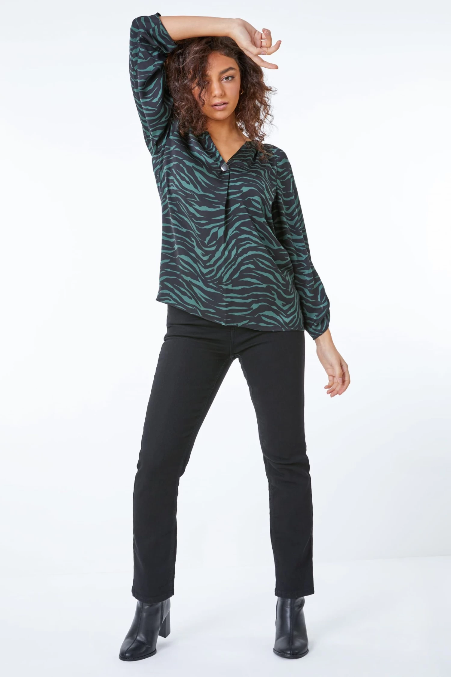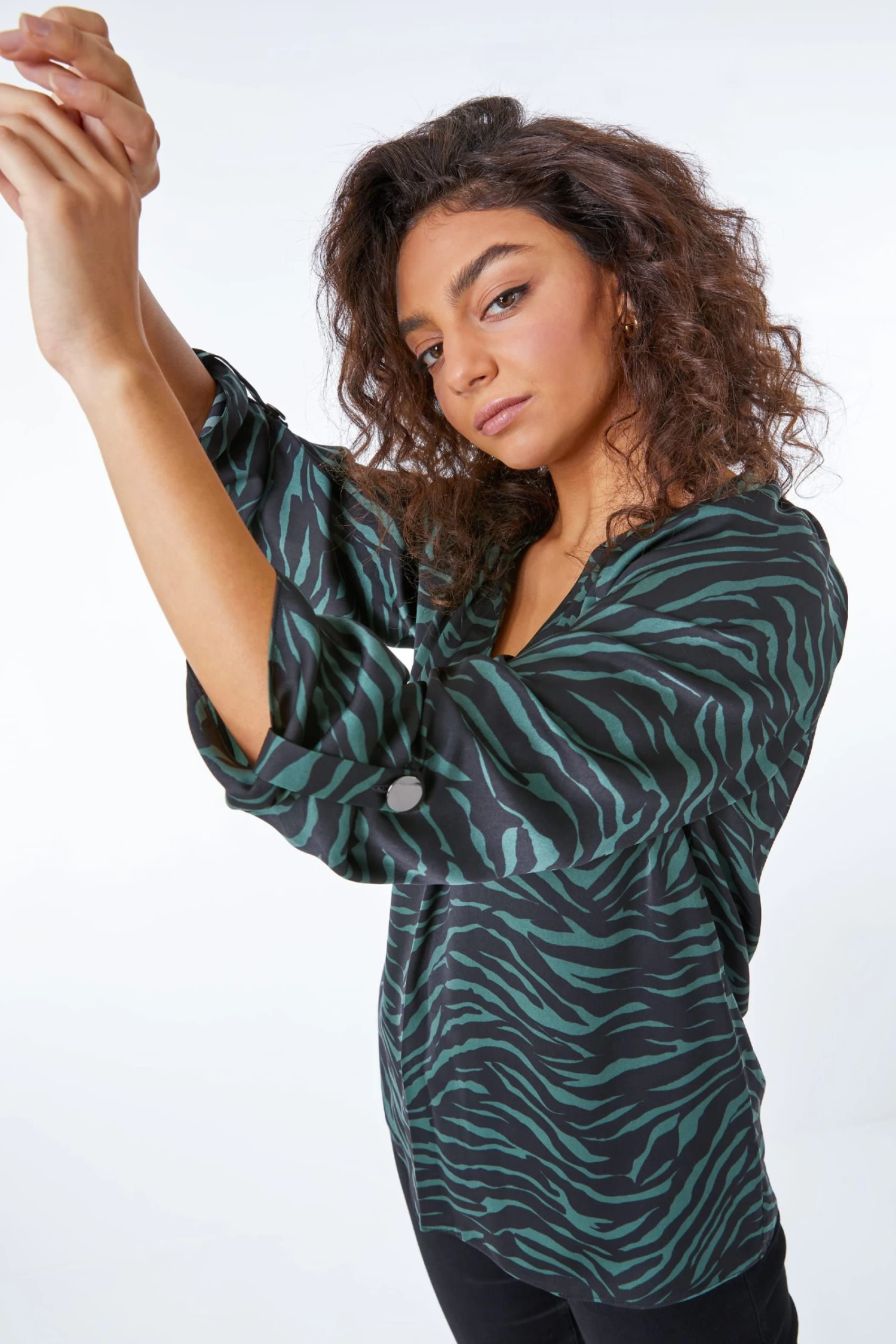 Take a walk on the wild side with this petite, animal print shirt. Cut from a smooth, woven fabric this piece features a feminine V-neckline and sophisticated full length sleeves. It's adorned in a striking animal print and finished with a centre, feature button. Pair with mom jeans and ankle boots for an transitional look!