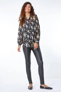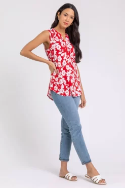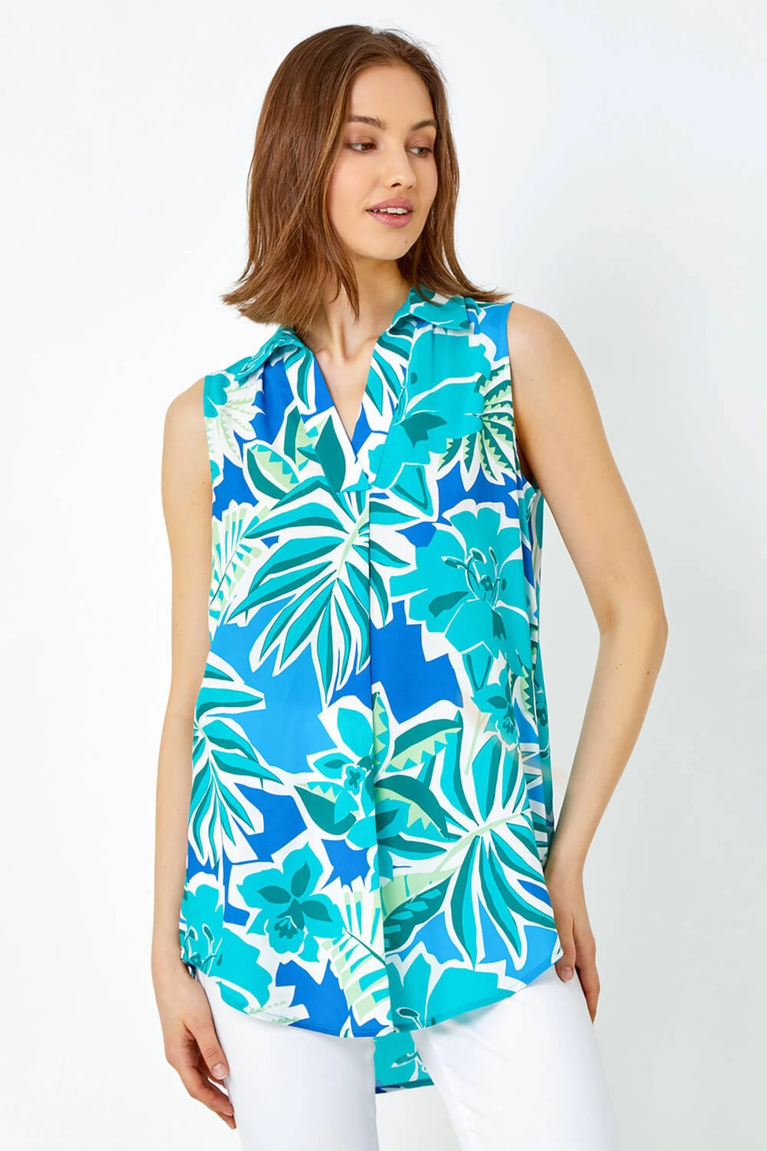 Adorned with a bright tropical print this sleeveless blouse is perfect for holiday season. Cut from a smooth woven fabric this piece features a collared v neckline and is designed in a Summer-ready sleeveless style. Designed to pull on overhead this piece is perfect paired with our cropped stretch trousers and simple sandals for effortless holiday style!