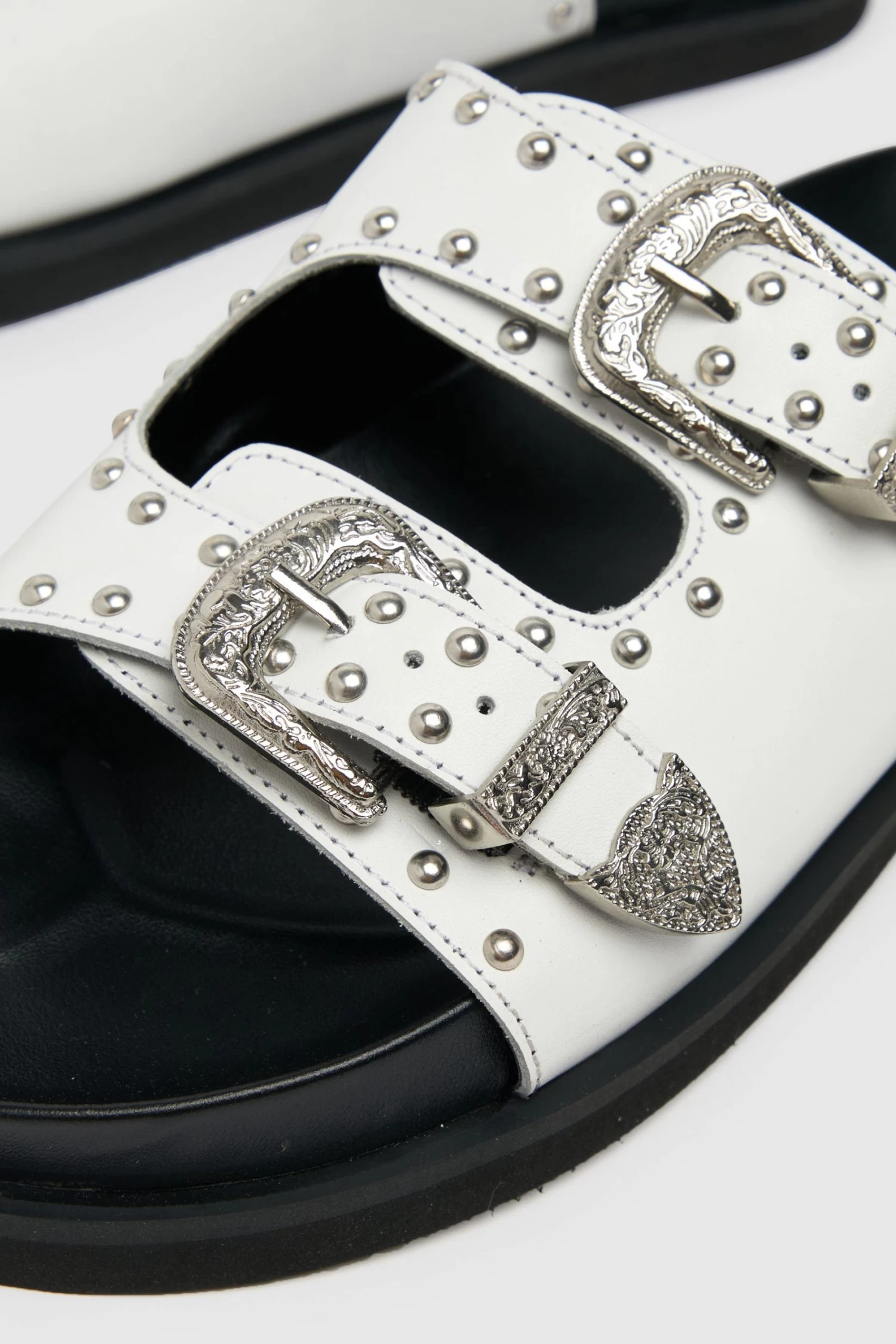The Schuh Treasure Leather Studded Sandal is crafted with a white leather with two chunky buckle straps for secure style. Stud detailing adds extra edge, a summer vacay look you don’t want to miss out on!