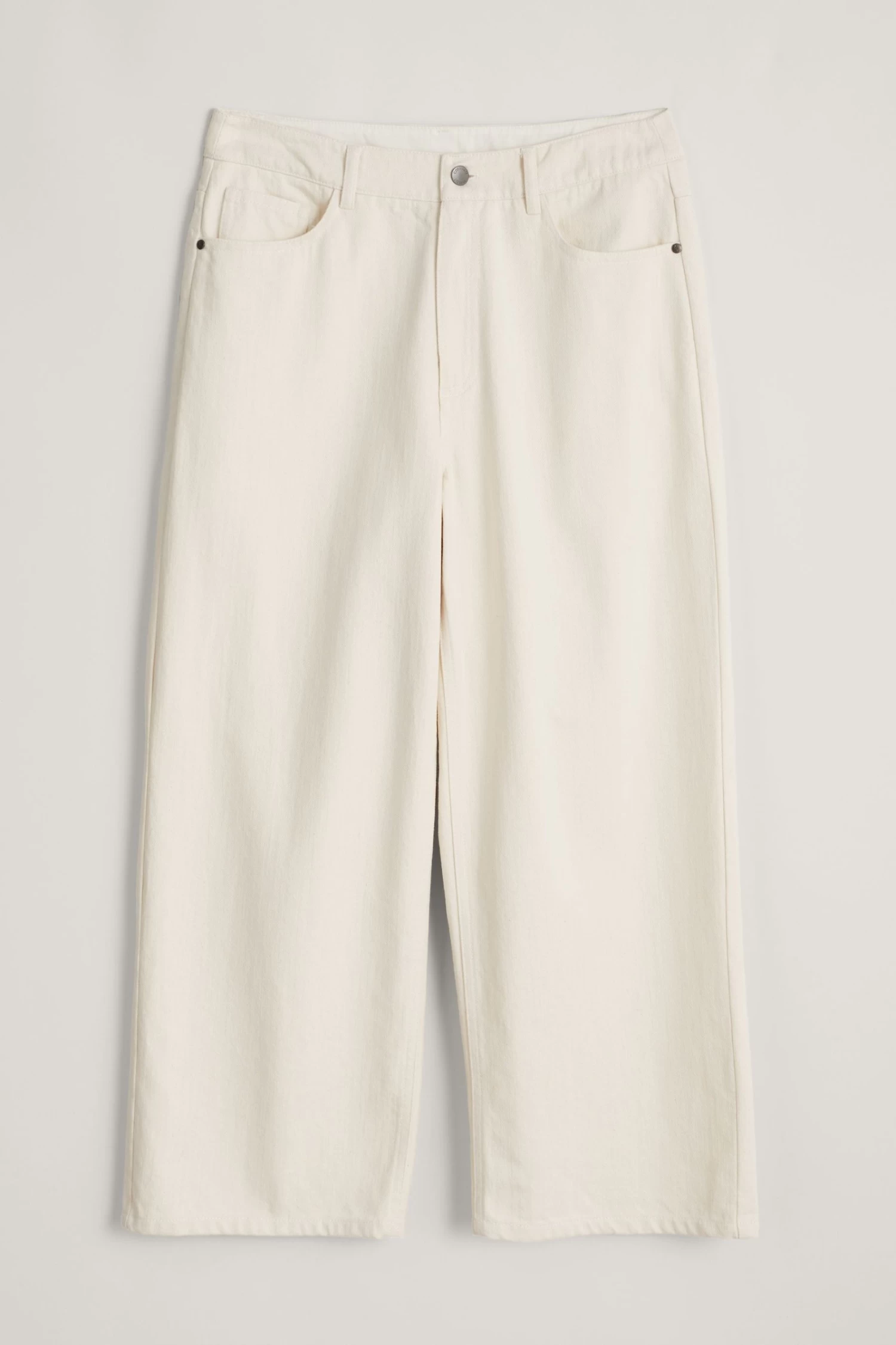Wide-leg denim cropped trousers with classic jeans detailing. A versatile piece you’ll reach for year-round.