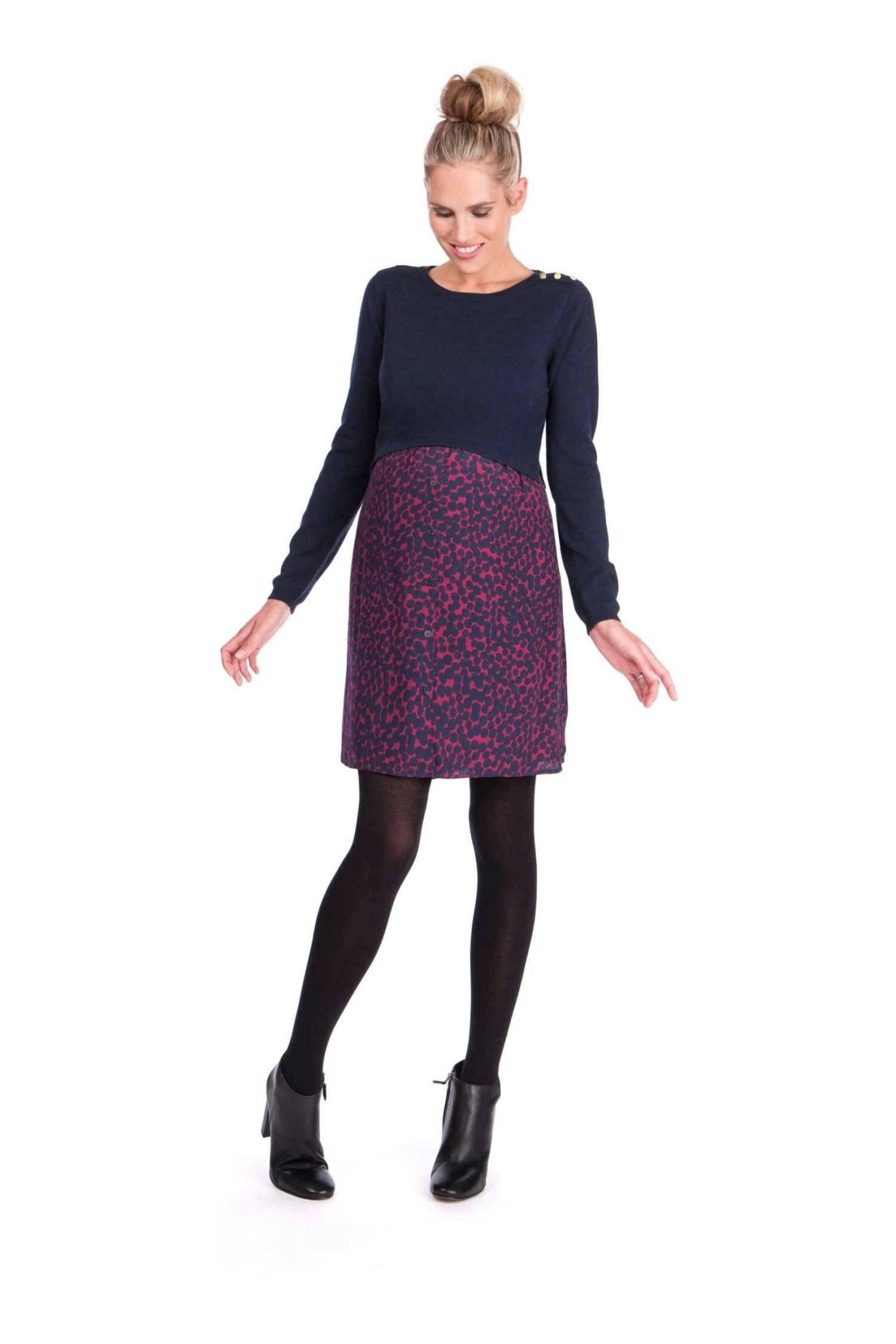 Stylish, comfy and easy to wear, our Navy Blue Mock Jumper Maternity And Nursing Dress offers a flattering fit for every stage of pregnancy and easy nursing access afterwards. The soft woven skirt drapes effortlessly over your curves, featuring a stylish print and an on-trend button down front. The detachable knitted top is slightly cropped, finishing at a figure-flattering point, just below your empire waist, and can be lifted up to allow easy nursing access after baby is born.