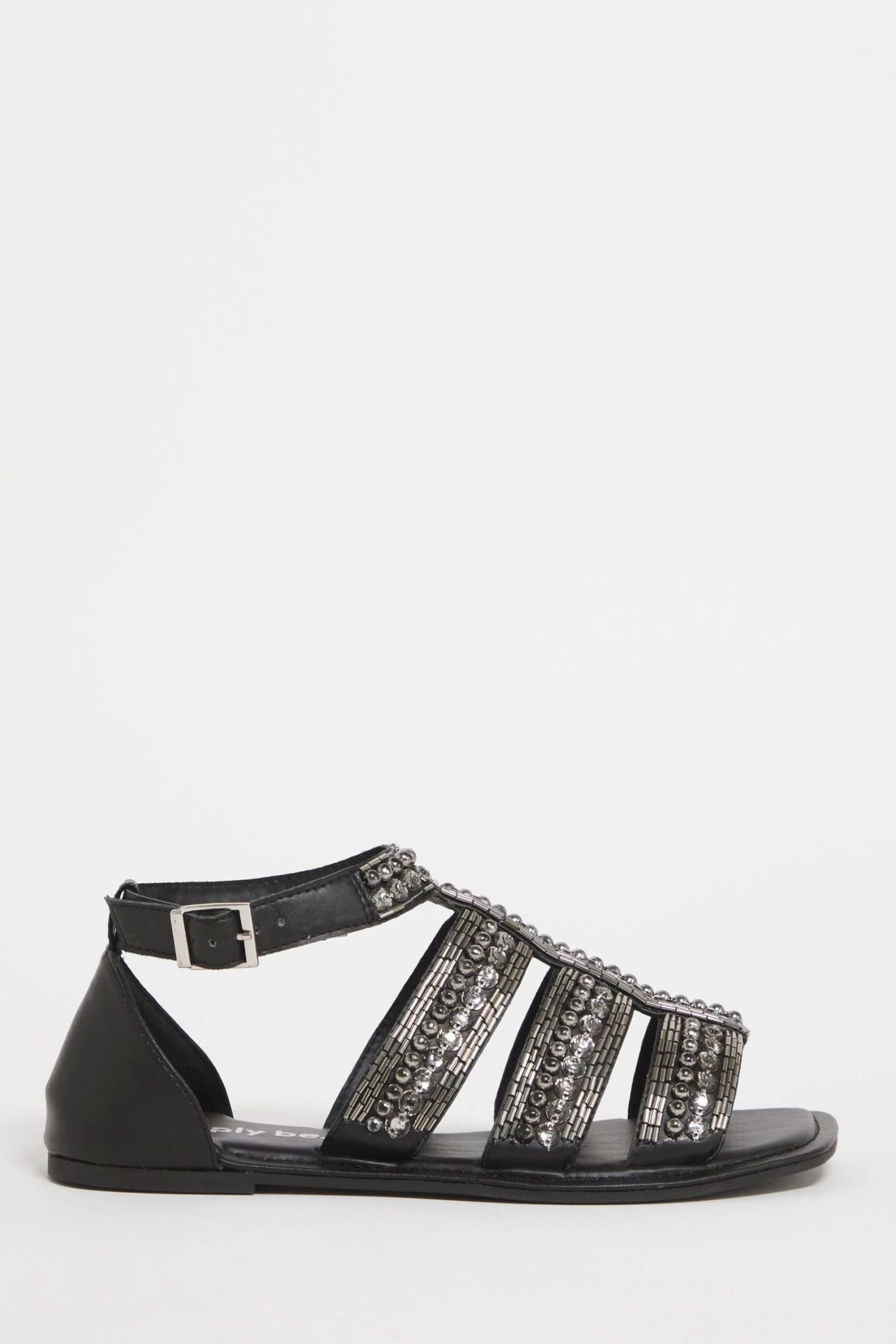 Not a heels girl? These lovely flat embellished sandals are the perfect alternative for any occasion. They feature an embellished gladiator style upper, ankle buckle fastening and square toe.