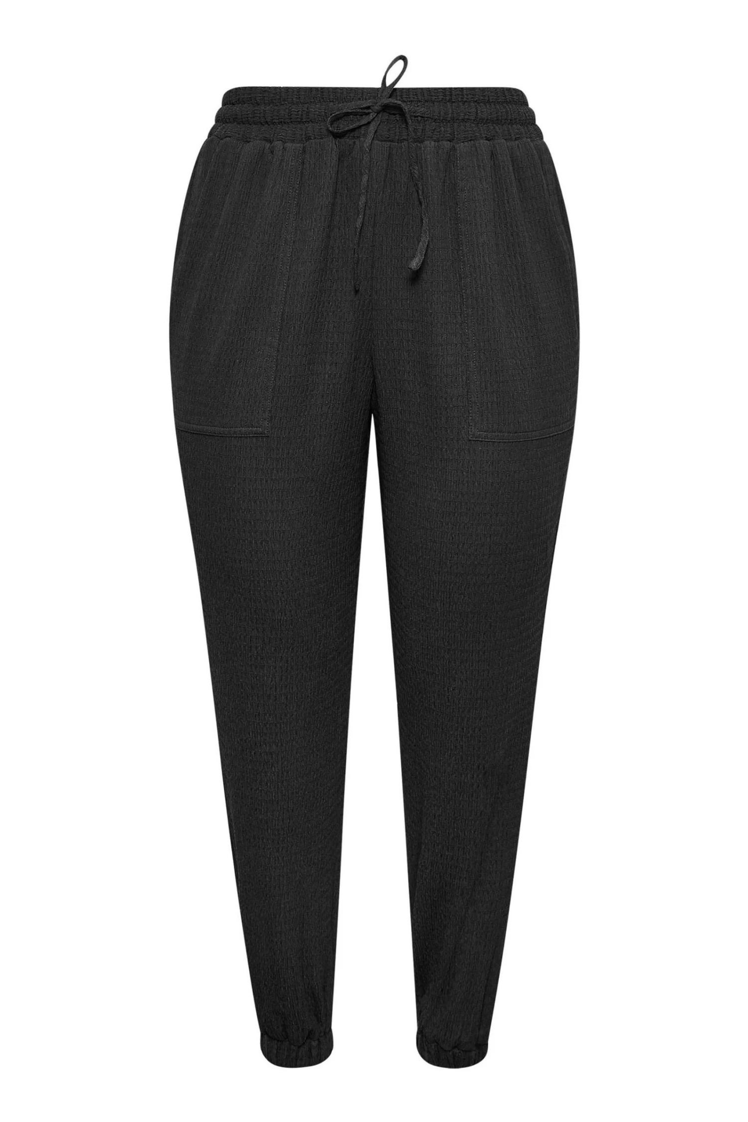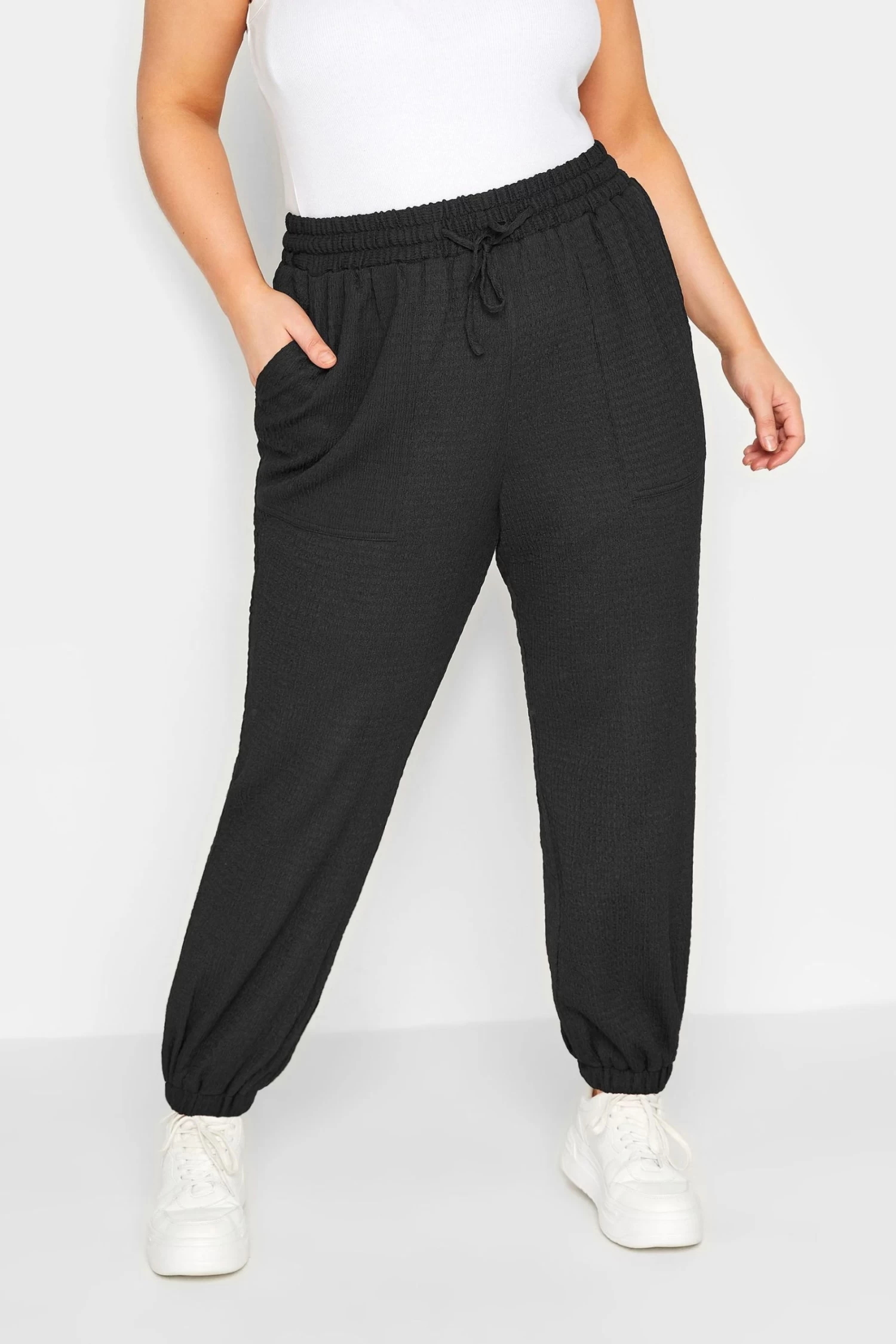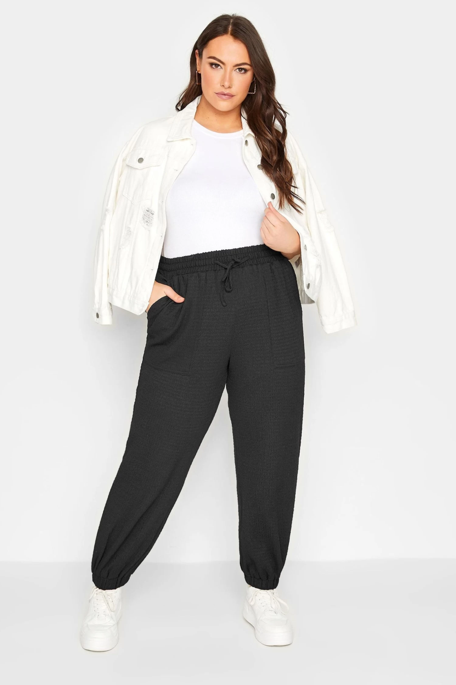 Stay comfortable and casual this season in these new-in plus size joggers. Made from a comfortable crinkle jersey fabric, they feature an elasticated waistband with a drawstring tie and two side pockets, complete with elasticated cuffs. Finish the look with a t-shirt and trainers. Why We Love It: Made for dress down days.